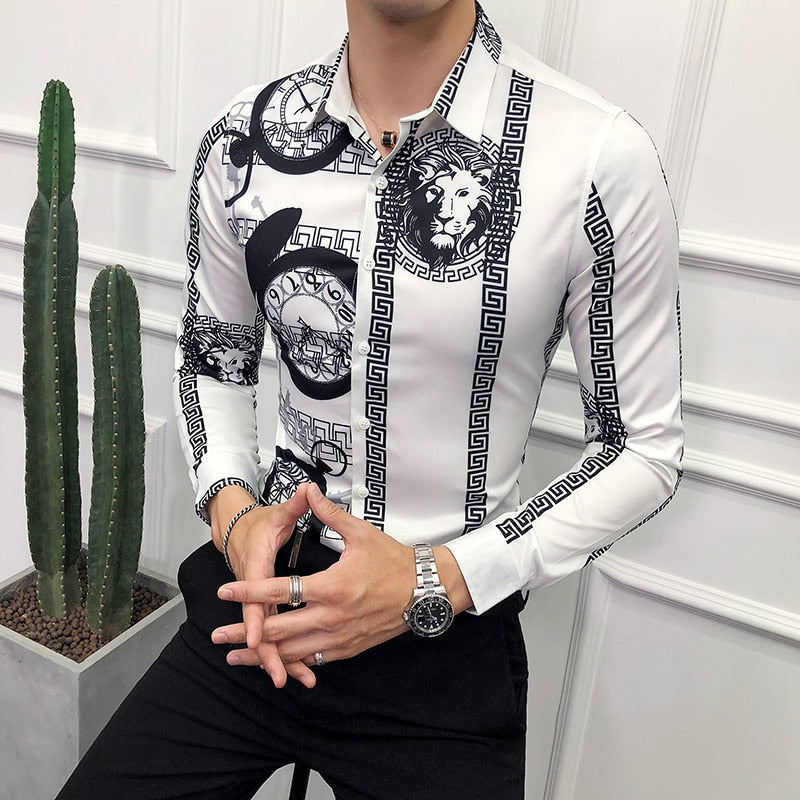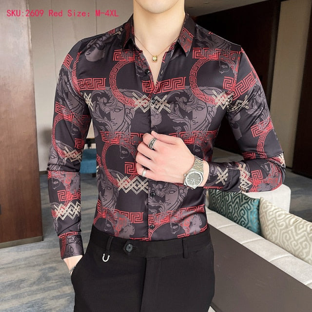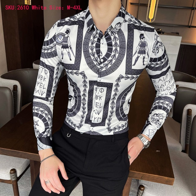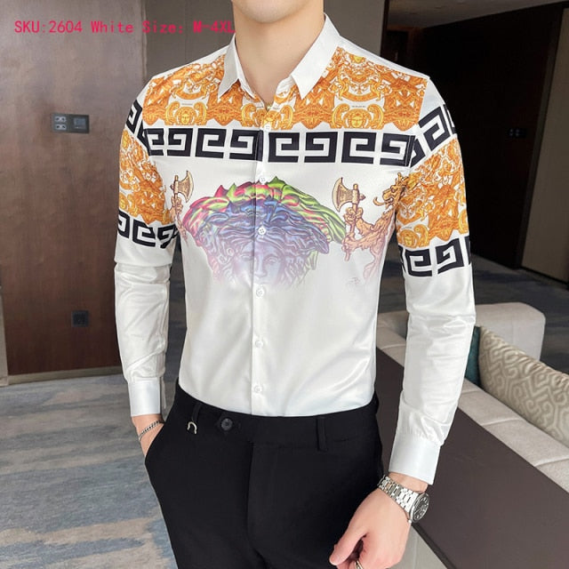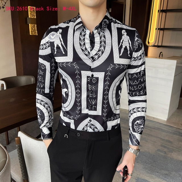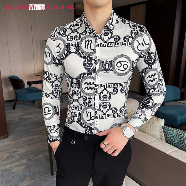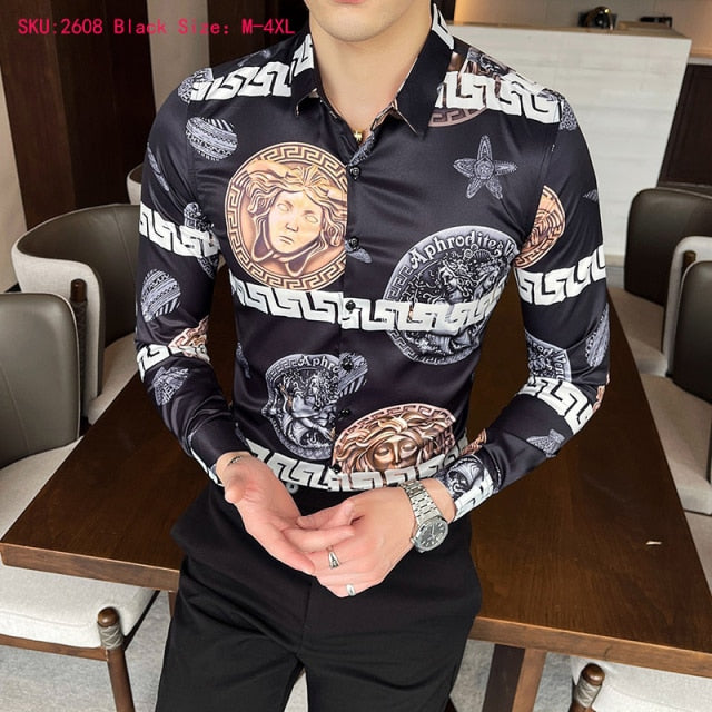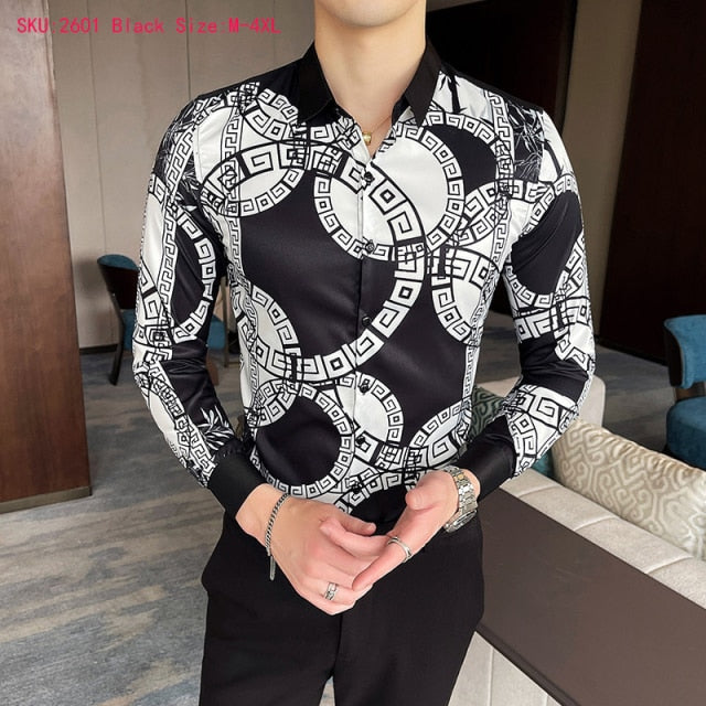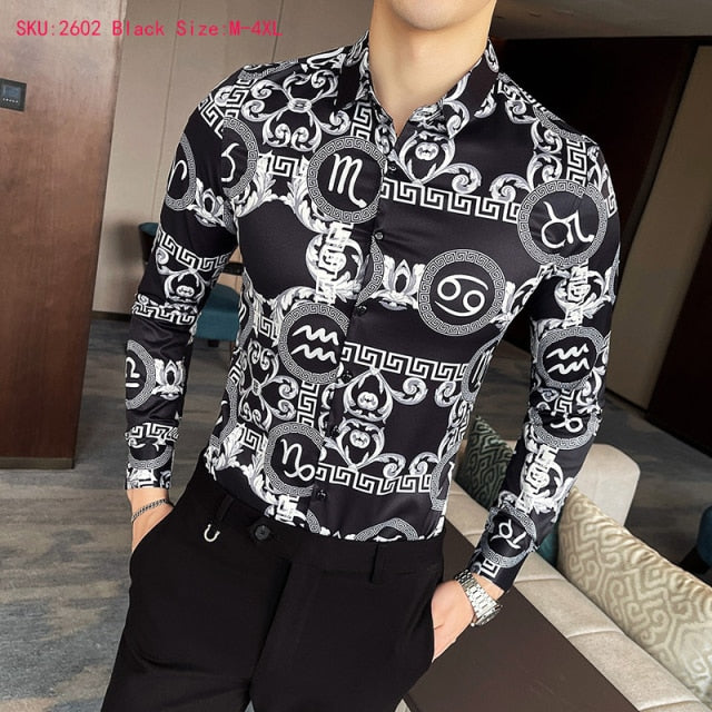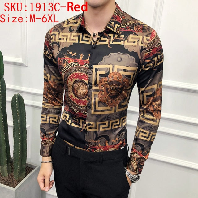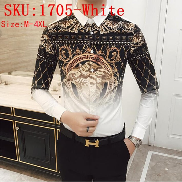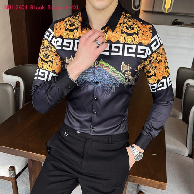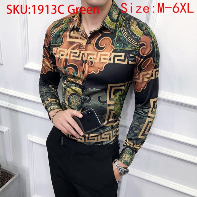 M-6XL Gold Luxury High-end Fashion Printed Men's Casual Long-sleeved Shirt Performance Stage Banquet Male Slim Shirt