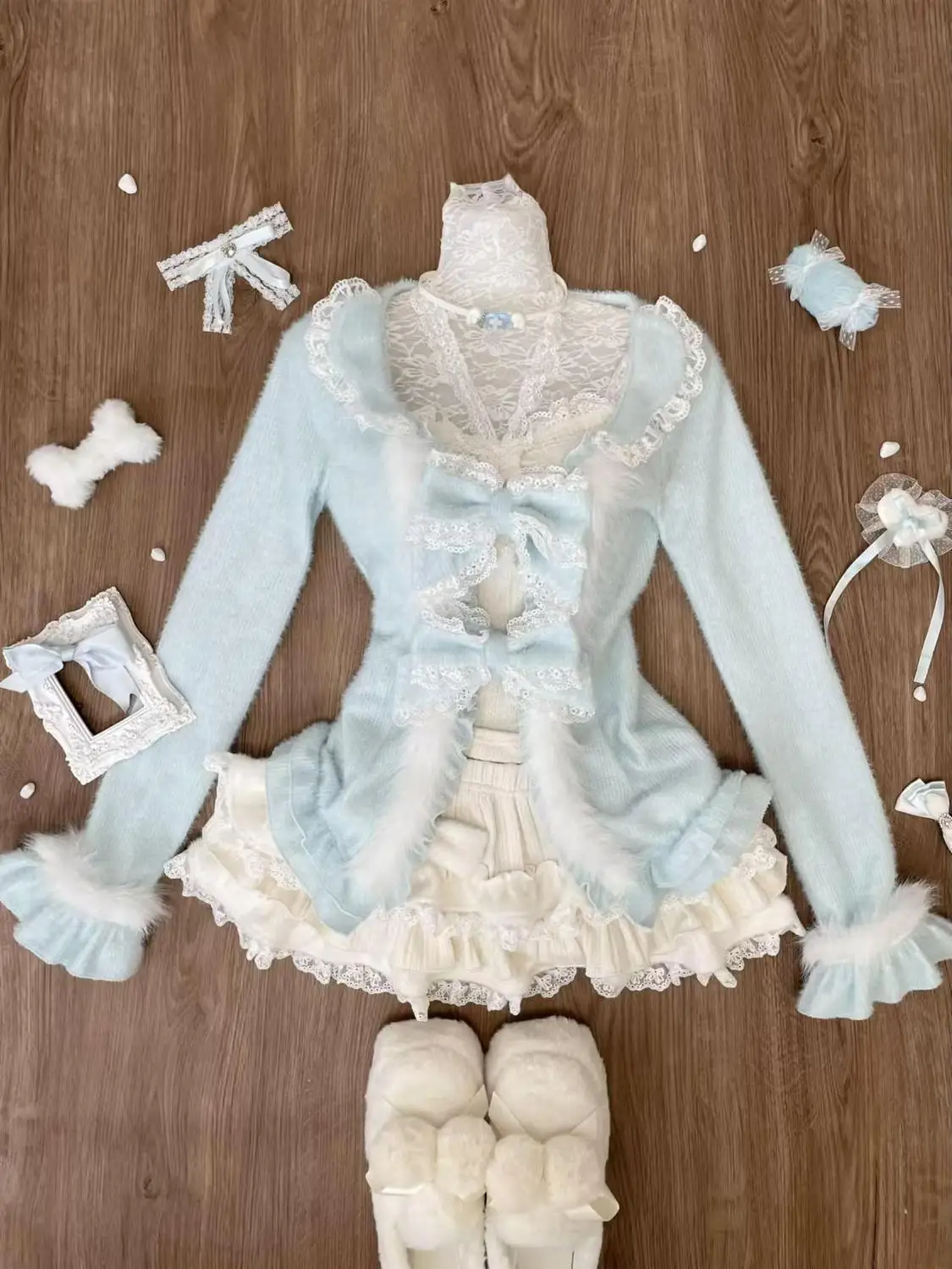 maoxiangshop  -  3 Pieces Set Women Slim Sweet Lace Patchwork Knitted Sweater + Slim Halter Grunge Vest+ Y2k Aesthetic Kawaii Cute Pleated Skirts
