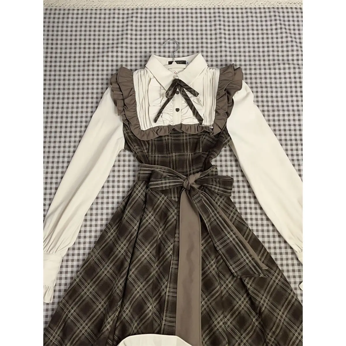 maoxiangshop - Autumn Fake Two Piece Spliced Long Sleeve Plaid Dress for Women Waist Slimming Sweet Girl College Style A-line Long Dresses