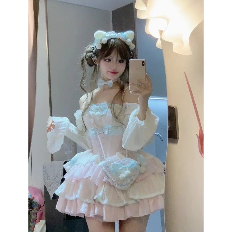 maoxiangshop  -  Autumn Lolita Kawaii Bow Dress Women Japanese Sweet Princess Dress Female Korean Fashion Print Cute Party Mini Dress 2024 New