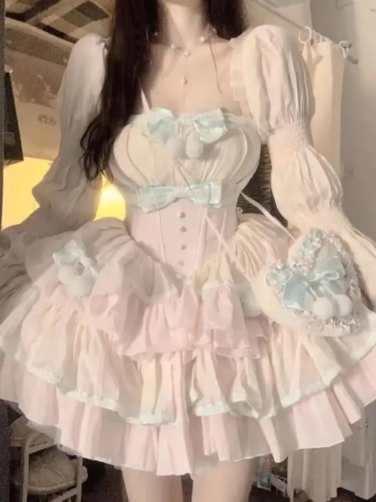 maoxiangshop - Autumn Lolita Kawaii Bow Dress Women Japanese Sweet Princess Dress Female Korean Fashion Print Cute Party Mini Dress 2024 New