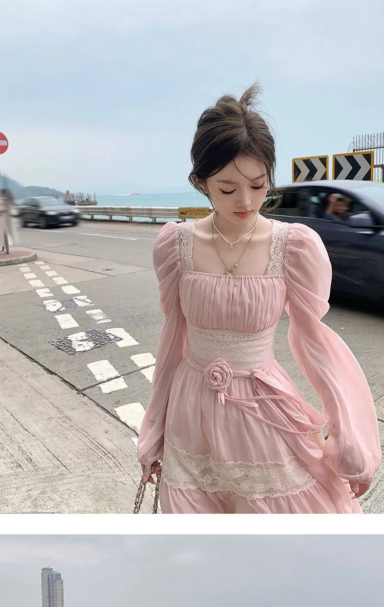 maoxiangshop - Autumn Long Sleeve Elegant Lace Dress Woman French Style Fashion Midi Dress Casual Party Slim One Piece Dress Korean Chic