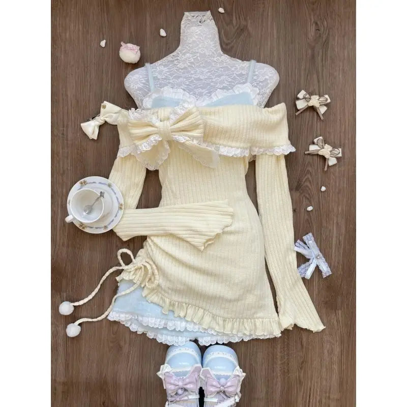 maoxiangshop  -  Autumn Sexy Hot Girl Off Shoulder Long Sleeve Lace Bow Strap Fake Two Piece Knitted Dress Slimming Wrap Hip Mini Dress for Women