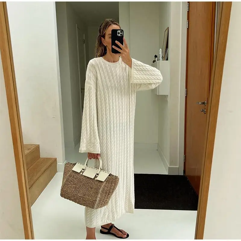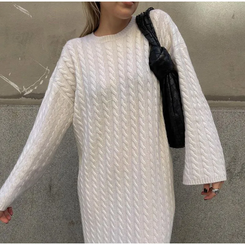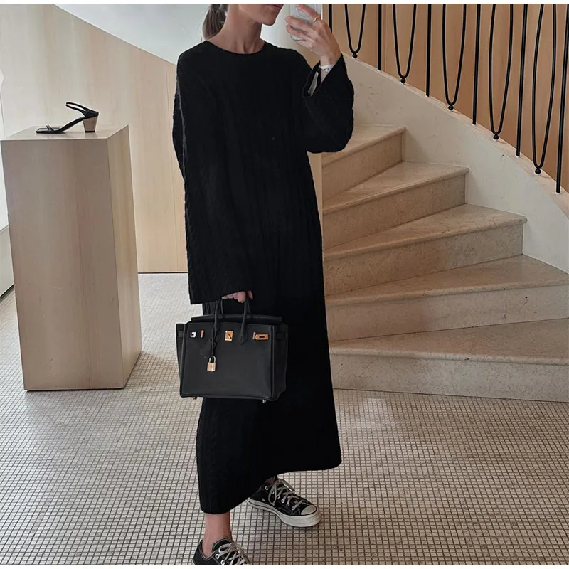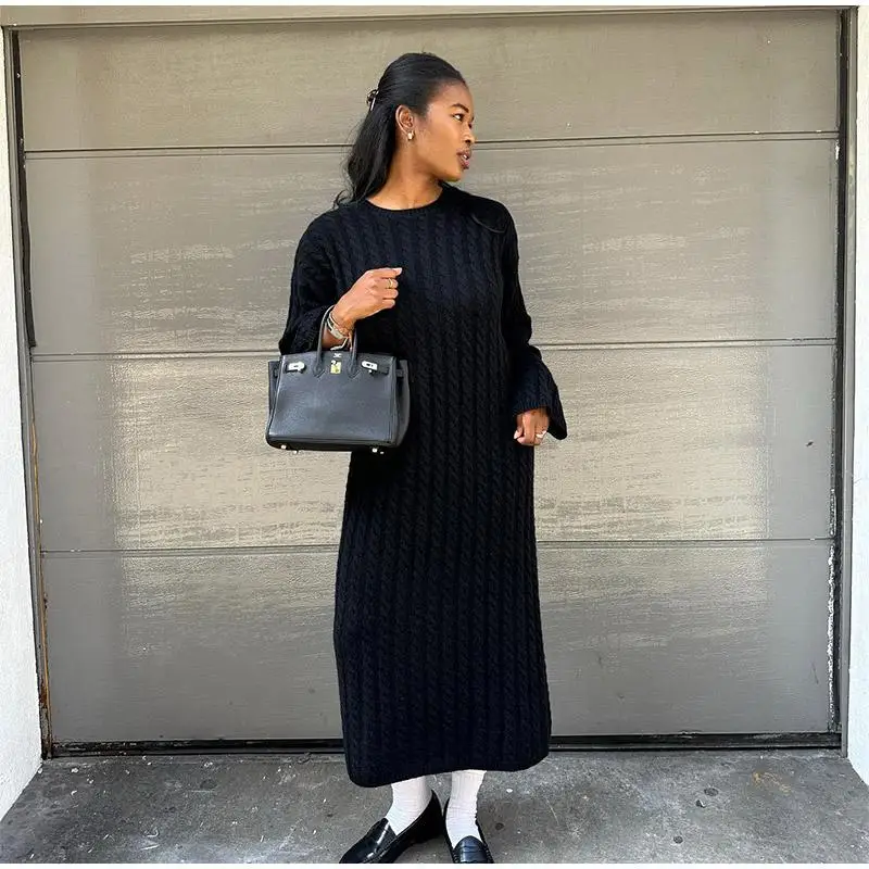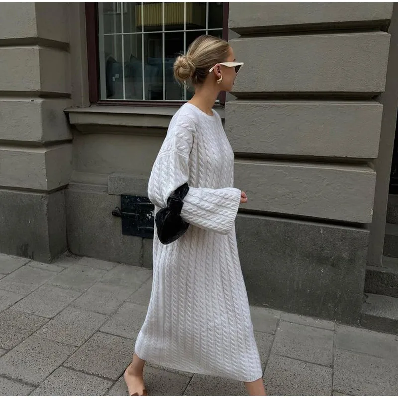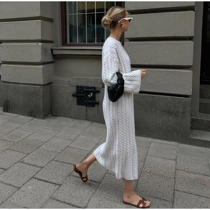 maoxiangshop Autumn Winter Knitted Dress Women Fashion Solid Color Ribbed Sweater Dress Female Elegant Casual Loose Long Sleeve Long Dresses