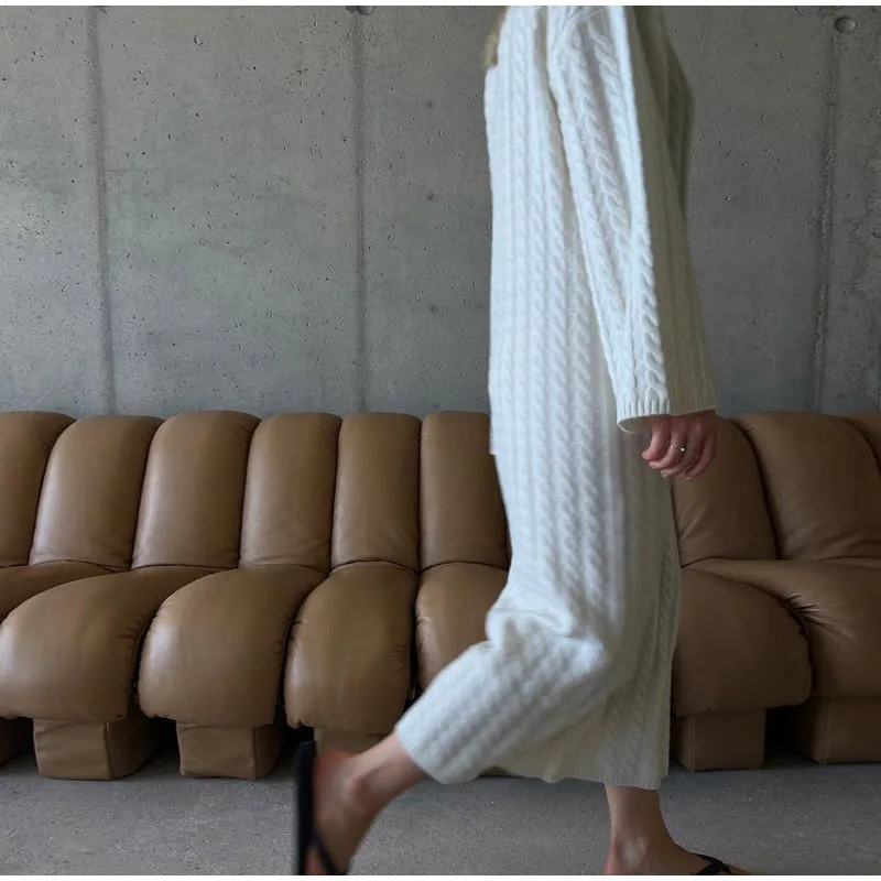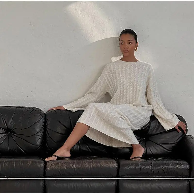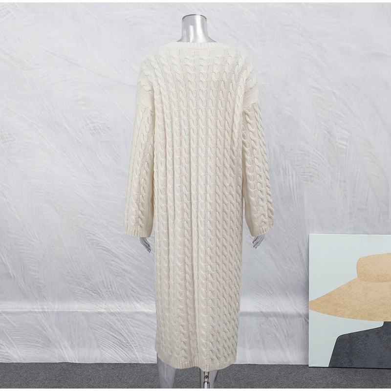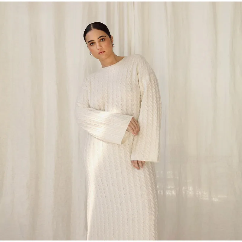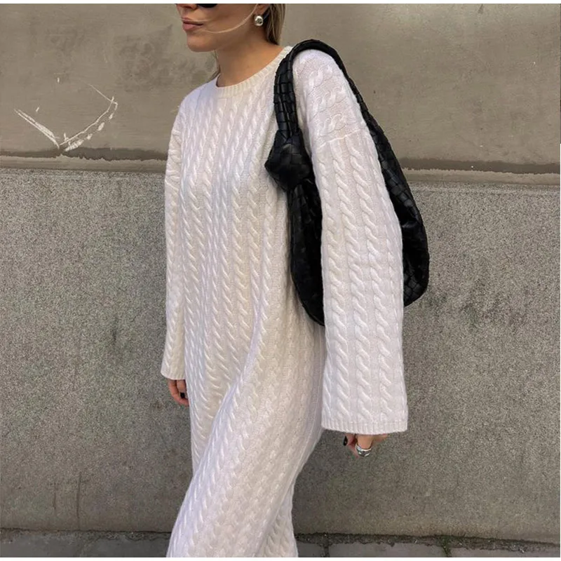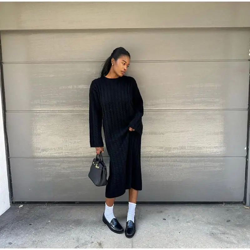 maoxiangshop Autumn Winter Knitted Dress Women Fashion Solid Color Ribbed Sweater Dress Female Elegant Casual Loose Long Sleeve Long Dresses