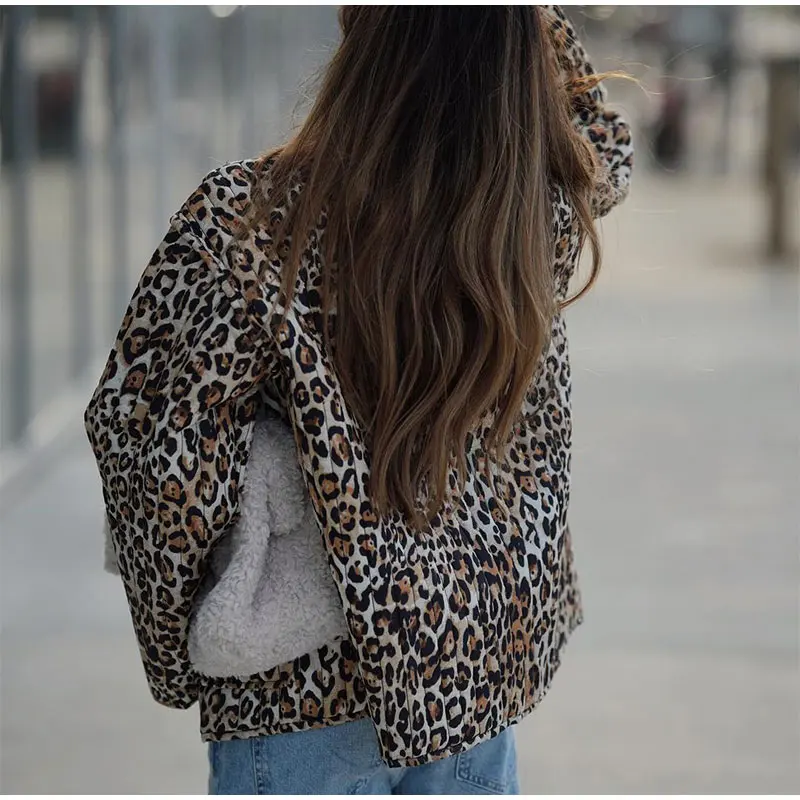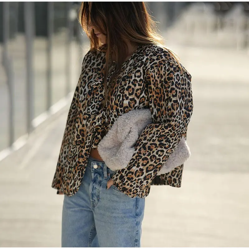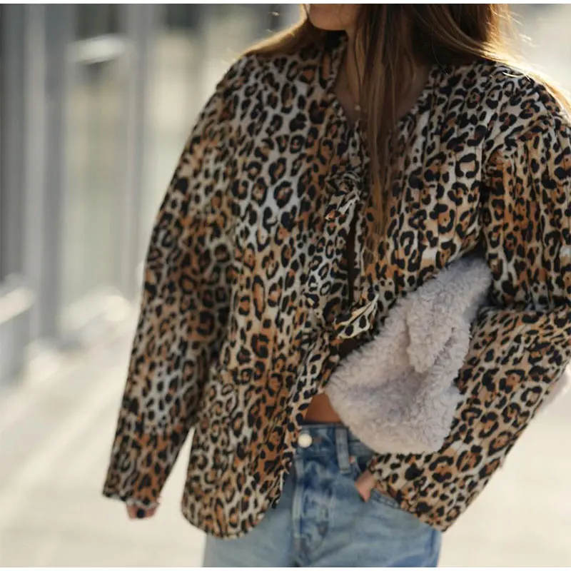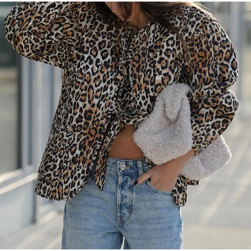 maoxiangshop - Autumn Winter Leopard Print Lace-up Padded Jacket Women Chic Long Sleeve Collarless Loose Coats 2024 New Lady Fashion Streetwear