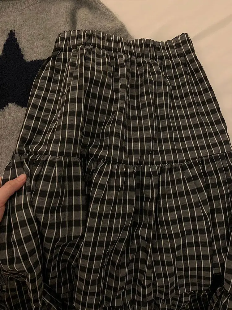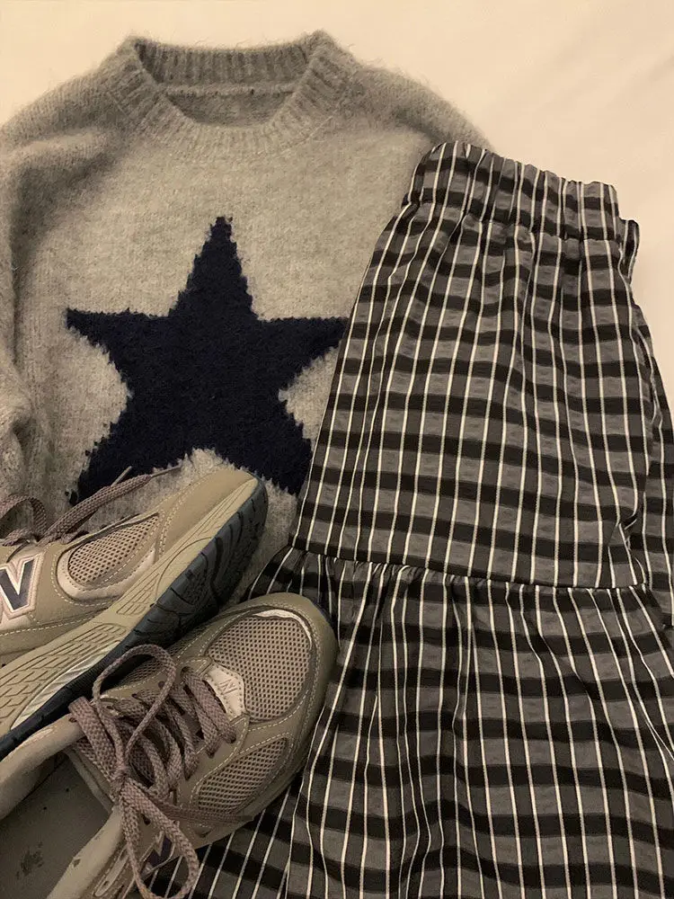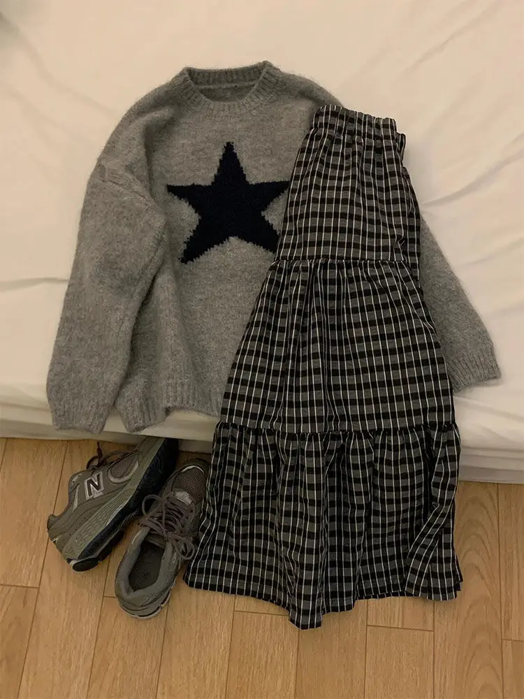 maoxiangshop - Autumn/Winter New Retro Casual Two Piece Set Women Outfits Simple Grey Round Neck Knitted Sweater+Plaid Skirt Maxi Skirt Set
