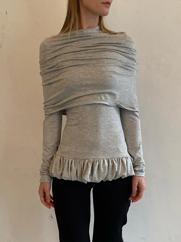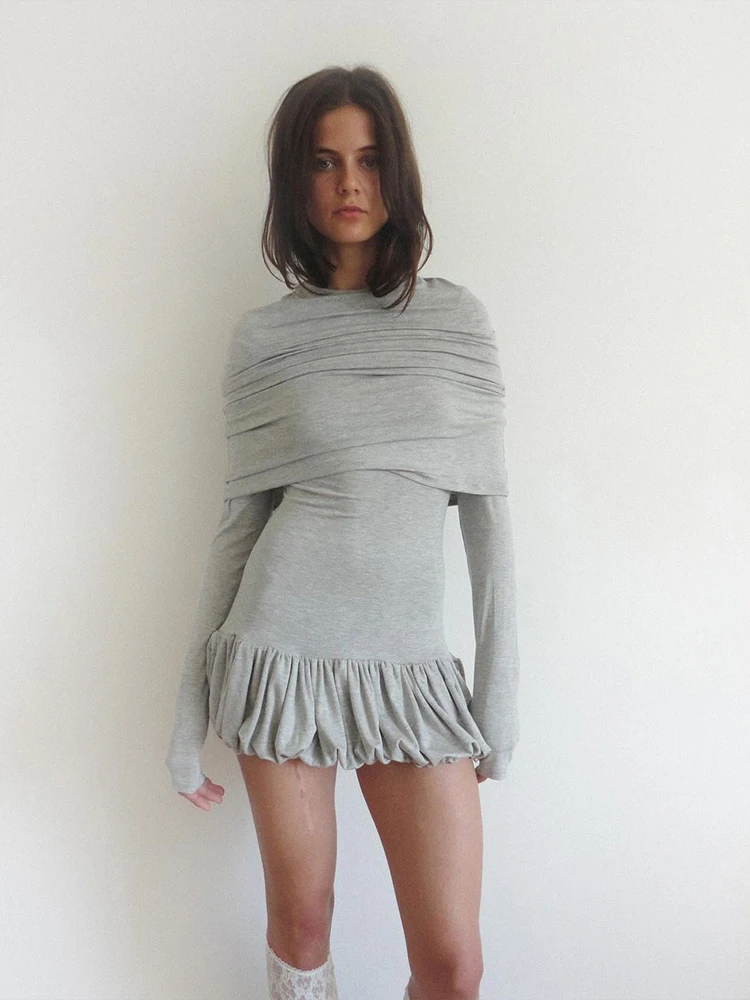 maoxiangshop - Autumn Women Dress Solid Basic Stretch Casual Classic Slash Neck Wild Patchwork Ruched Hem Long Sleeve Soft Home Bodycon