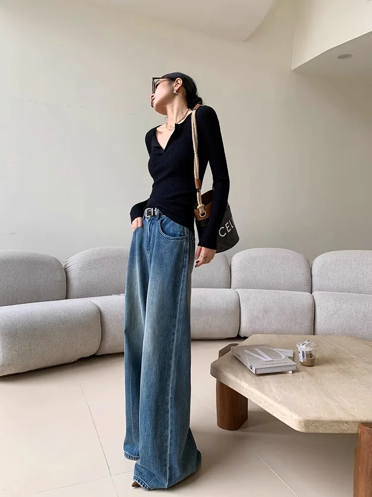 maoxiangshop - Blue Washed Casual Jeans Women'S Autumn And Winter New Straight Leg Loose Wide Leg Pants Long Pants