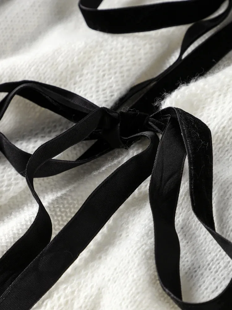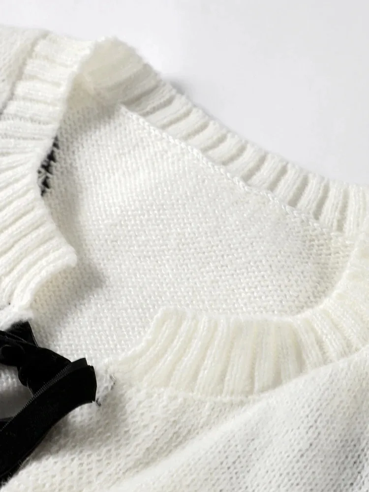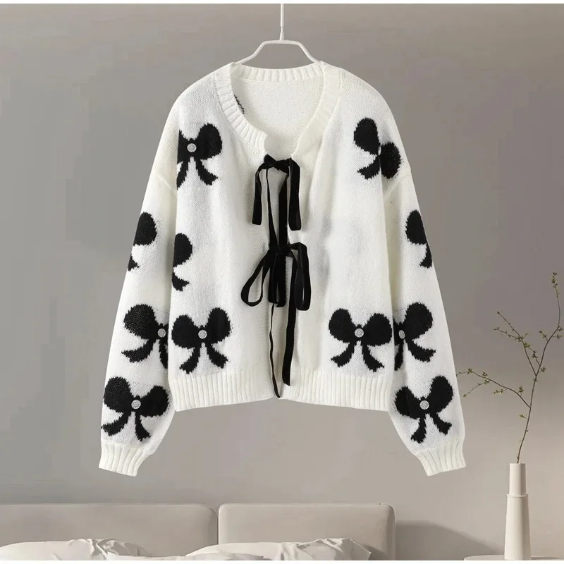 maoxiangshop - Bow Lace Up Knitted Women Sweater Preppy Hollow Out O-neck Long Sleeve Female Cardigan Autumn Patchwork Lady Knitwear