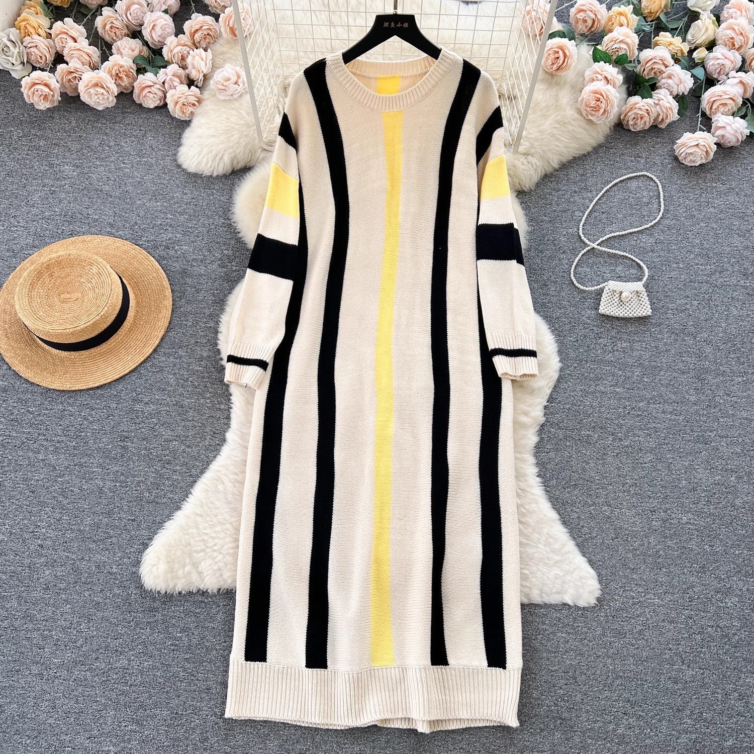 maoxiangshop business casual outfits Lazy Style Dress Women's Autumn and Winter Loose Casual Underwear Sweater Dress Slimming Temperament Striped Contrast Color Dress