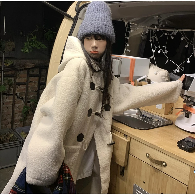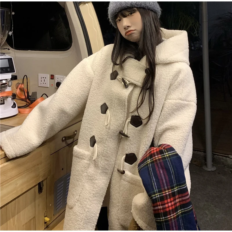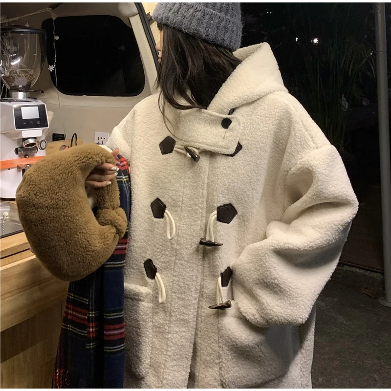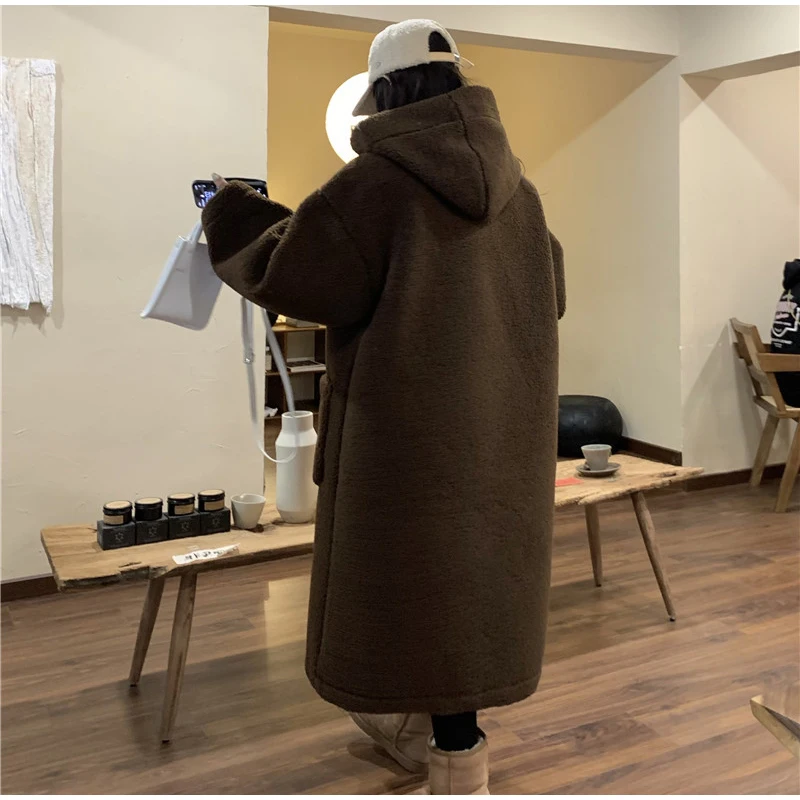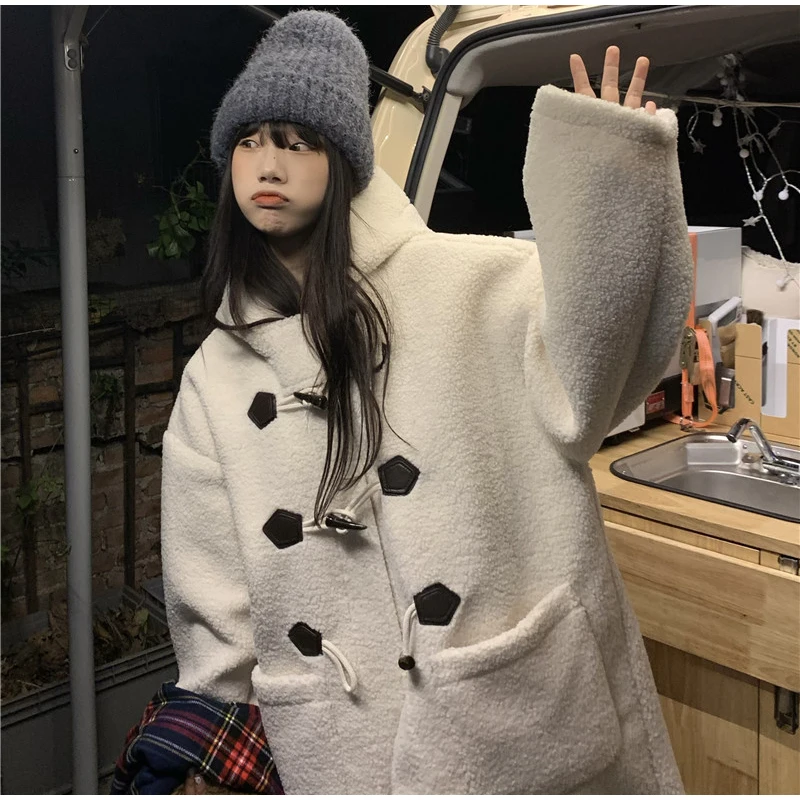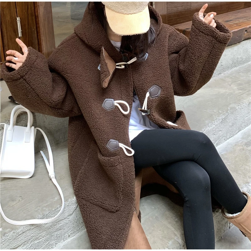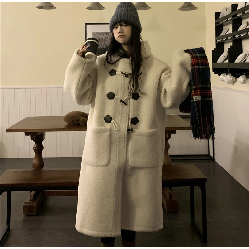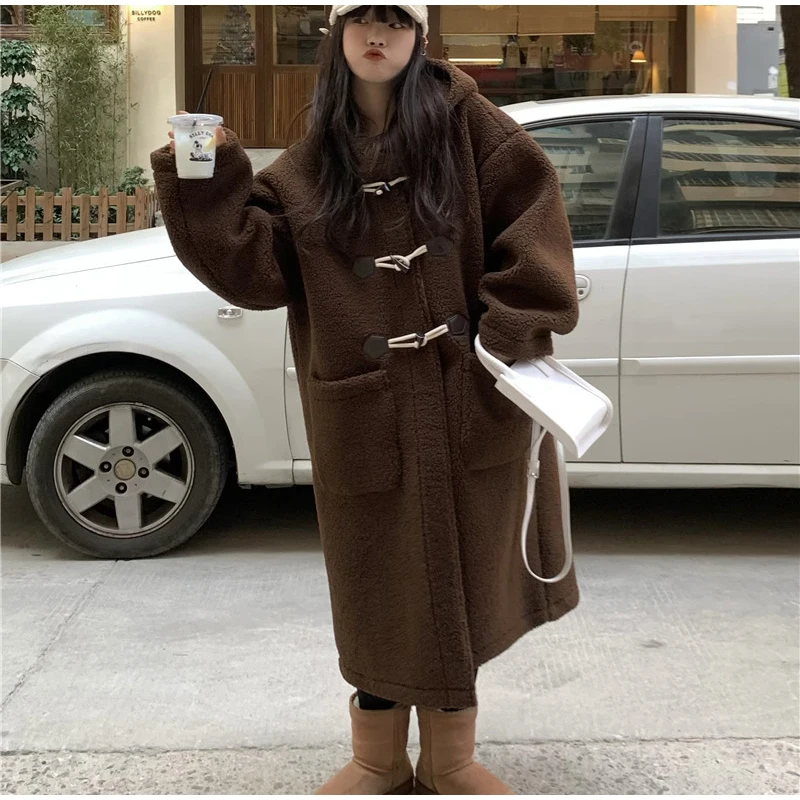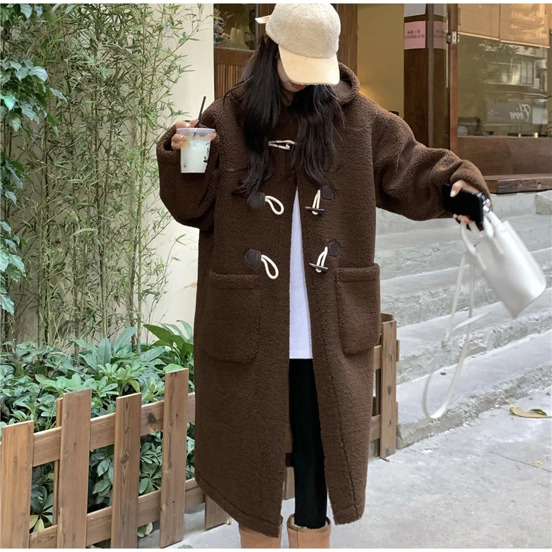 maoxiangshop - Casual Fluffy Lamb Wool Long Coats Women Warm Loose Horn Button Pockets Solid Coat Female Winter Elegant Chic Streetwear