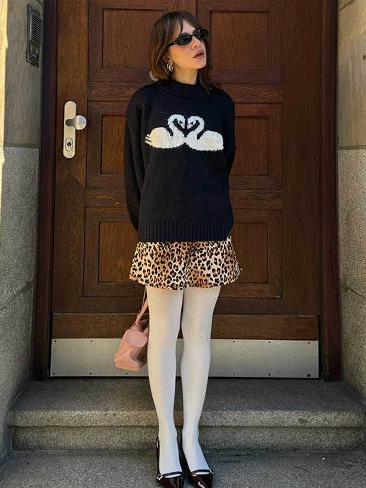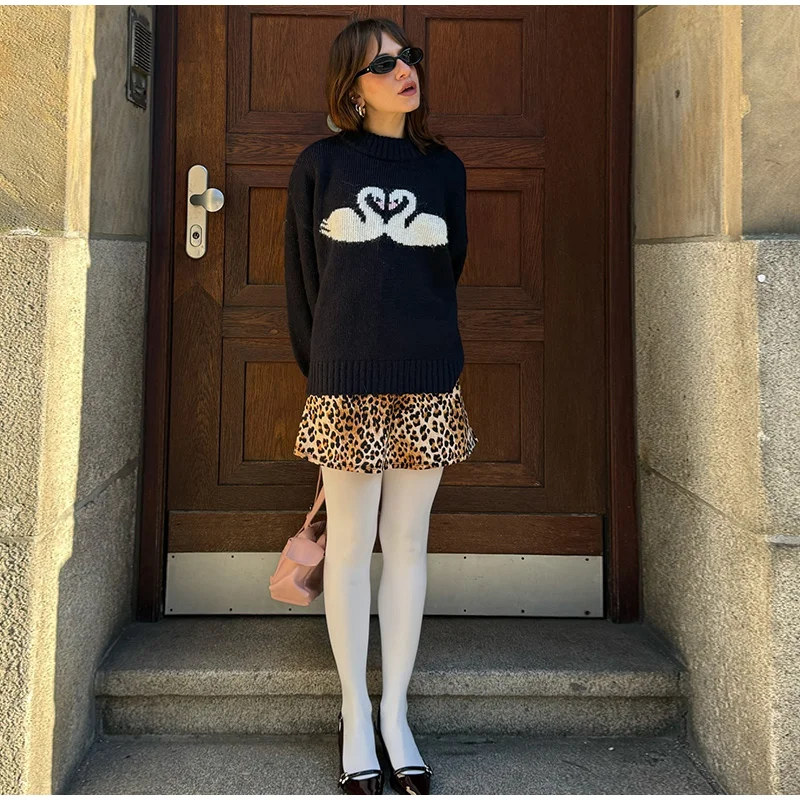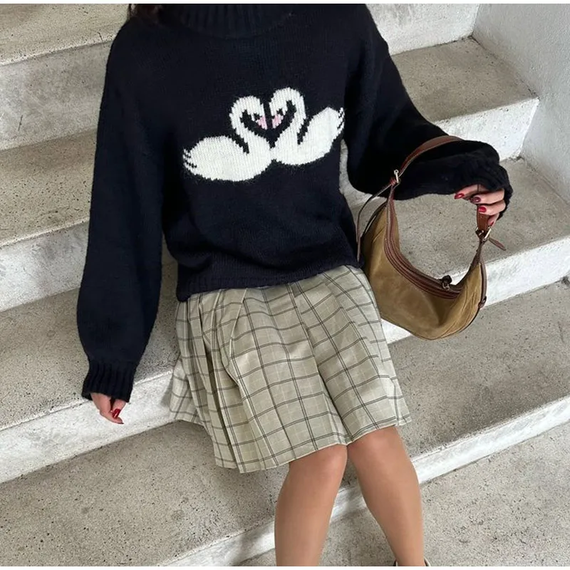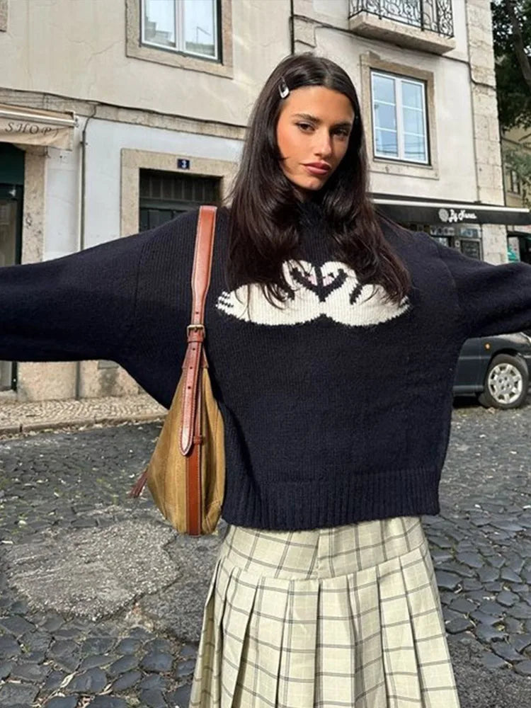 maoxiangshop - Casual Knitted Printed Half Neck Sweater Women Vintage Loose Black Swans Pullover Sweaters Female Autumn Chic Elegant Knitwear