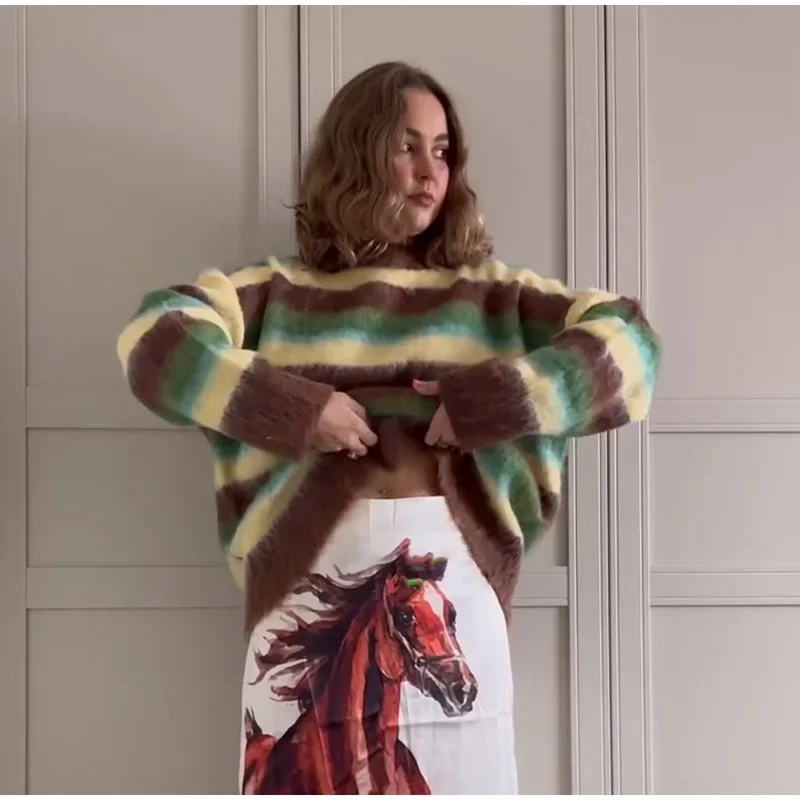 maoxiangshop - Casual Striped Mohair Sweater Women Loose Contrast O-neck Long Sleeve Pullovers 2024 Autumn Winter Lady Street Outwear