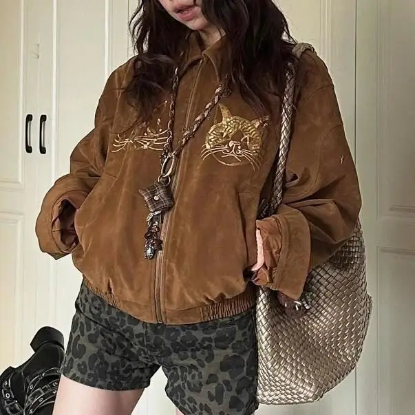 maoxiangshop - cute winter outfits Cat Embroidery Brown Heavy Embossed Suede 2024 Jacket Women Autumn Winter Vintage Long Sleeve Leather Coat Fashion Eco Top