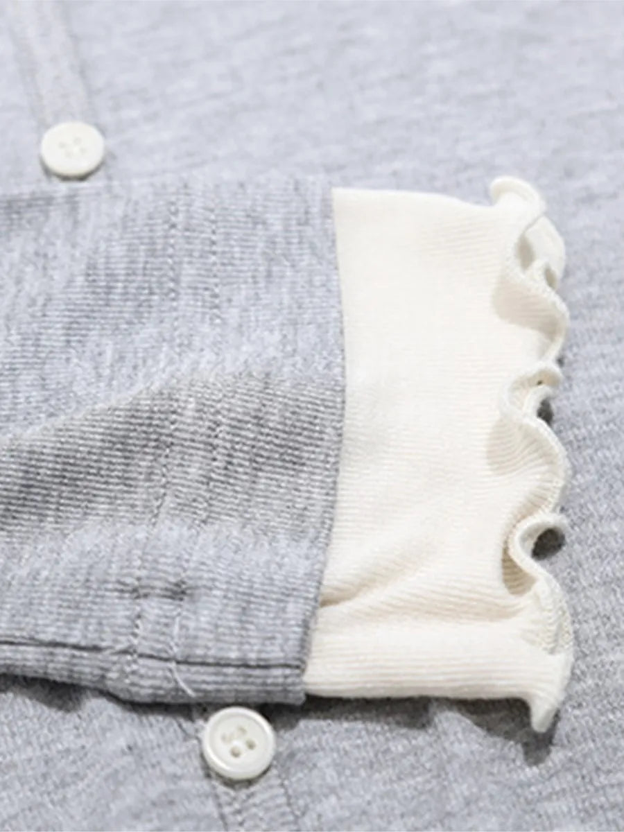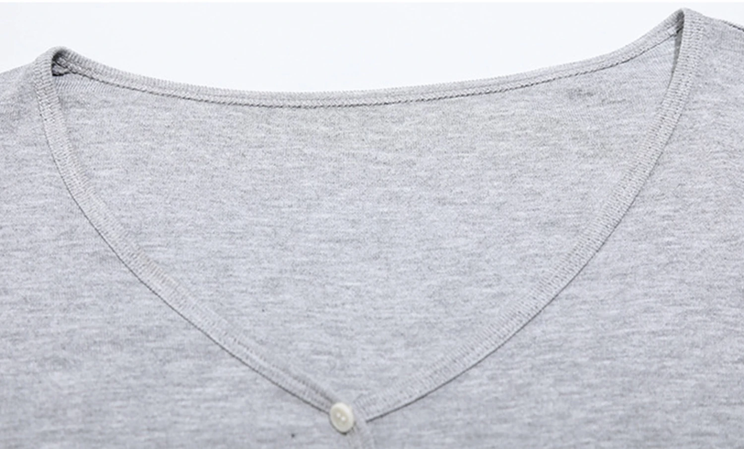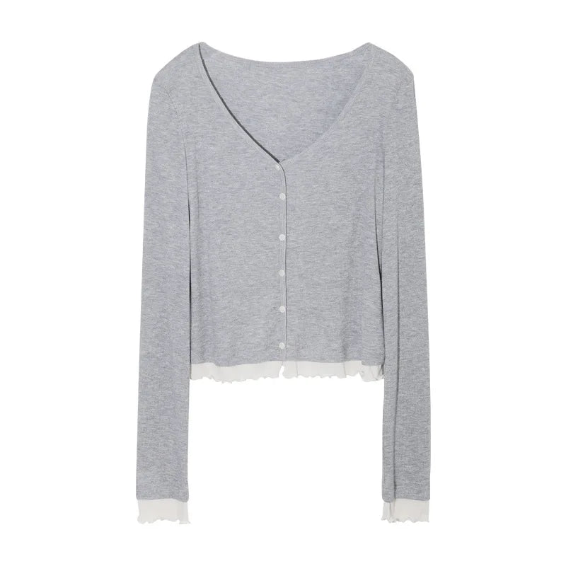 maoxiangshop - Contrast Fungus Trim Long Sleeve Autumn V Neck Single Breasted Slim Tops T-shirts Women Korean Fashion Simple T-shirts 2024 New