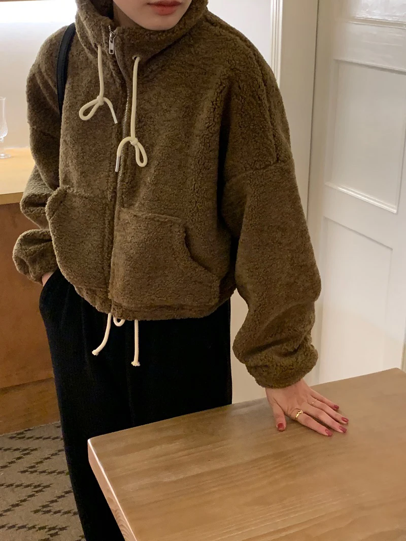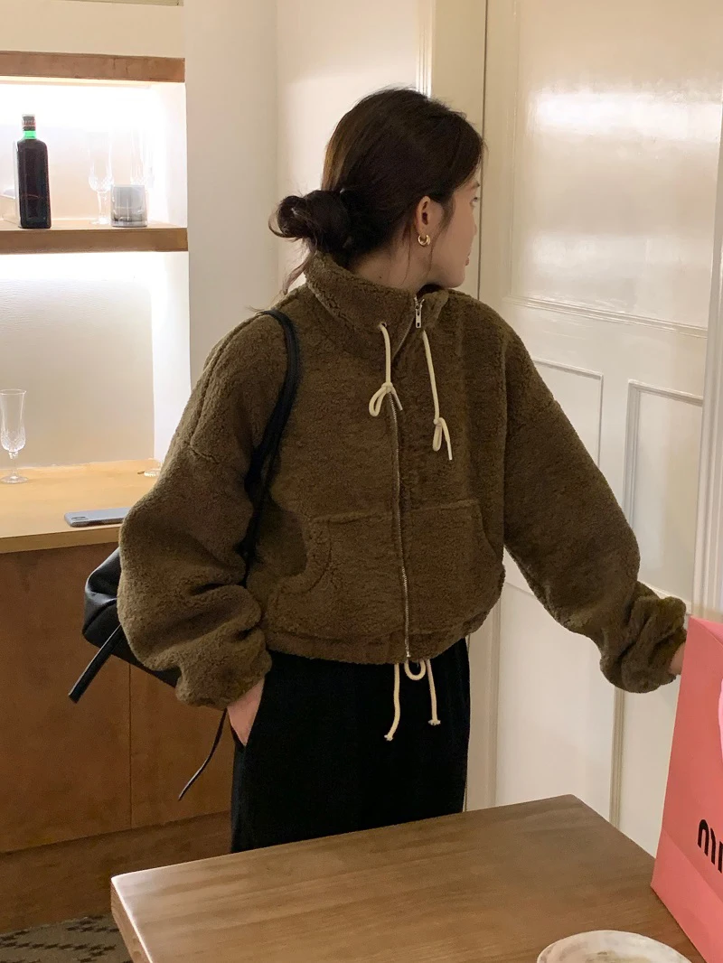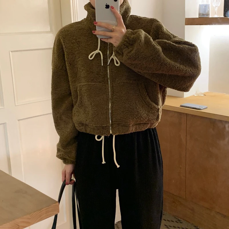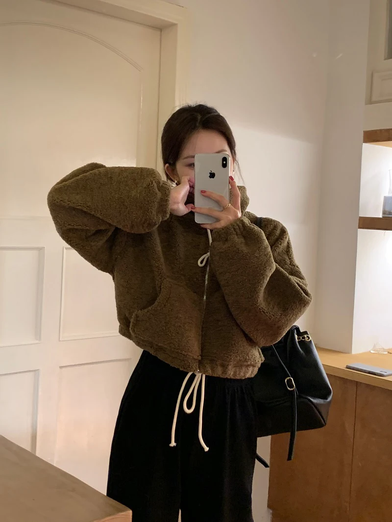 maoxiangshop - Cropped Lamb Wool Coat Women Streetwear Stand Zipper Short Jacket Winter Korean Solid Simple Warm Casual All Match Outerwear New