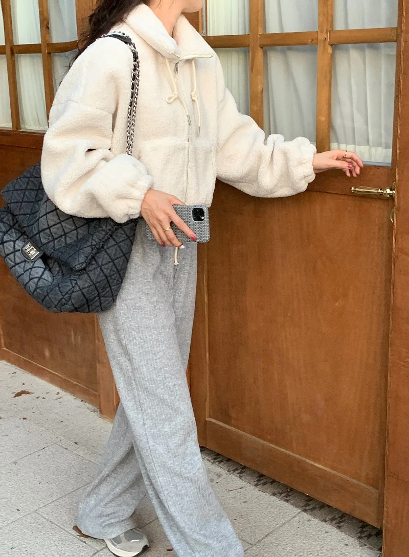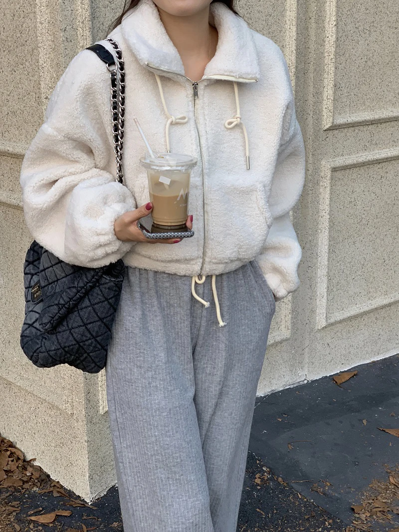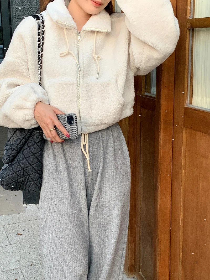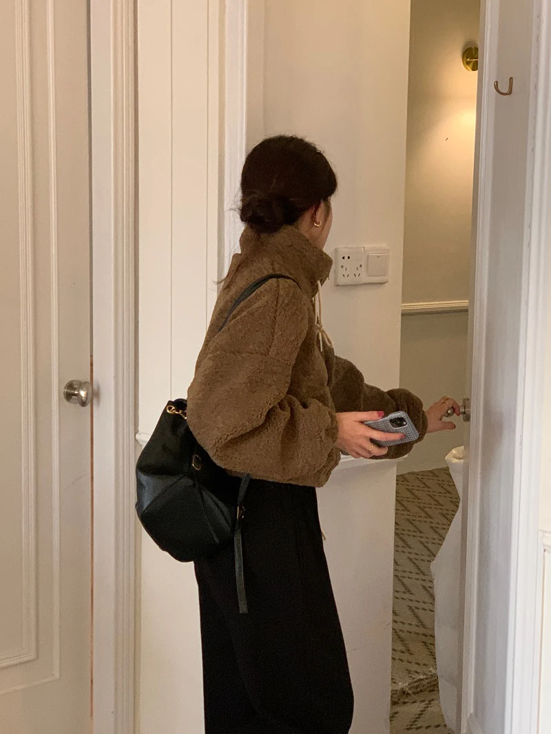 maoxiangshop - Cropped Lamb Wool Coat Women Streetwear Stand Zipper Short Jacket Winter Korean Solid Simple Warm Casual All Match Outerwear New
