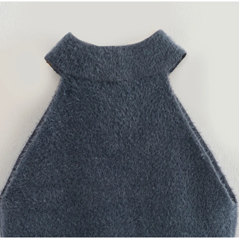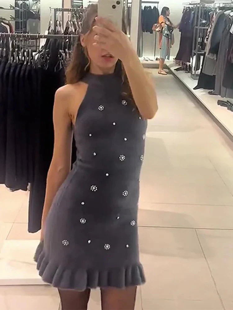 maoxiangshop - Elegant Bead Mini Dresses for Women Faux Fur Hanging Collar Sleeveless Slim Female Short Dress 2024 Autumn New Party Robes