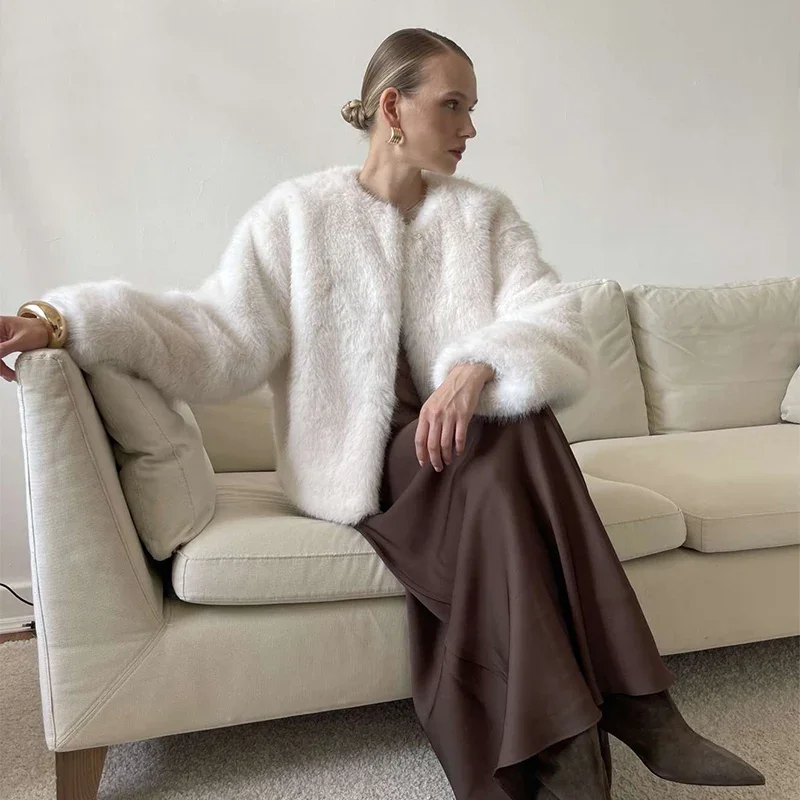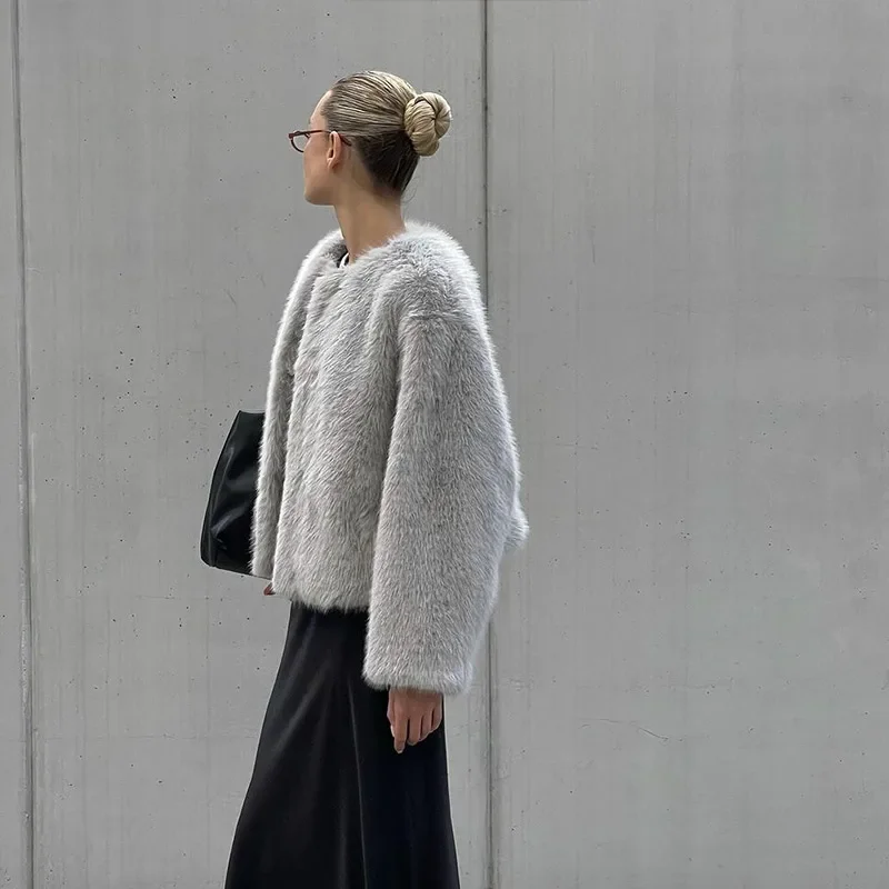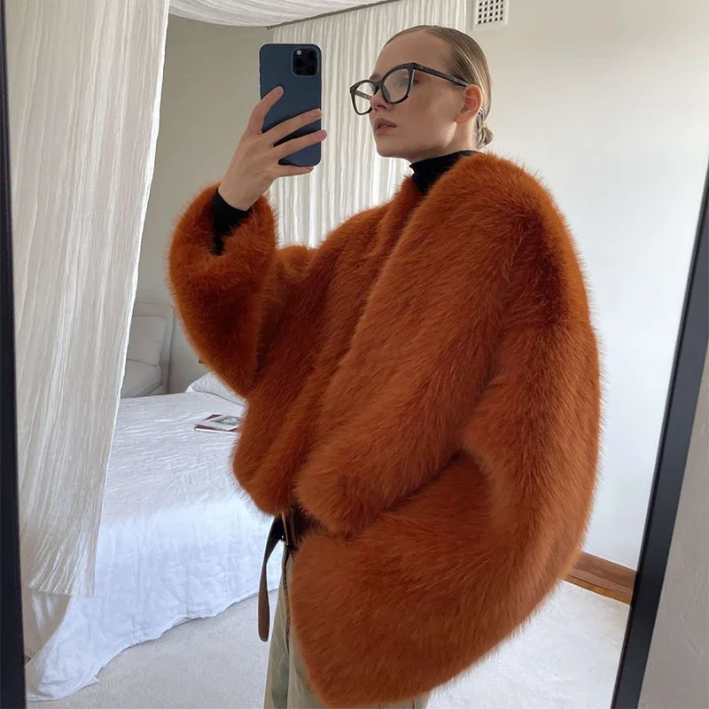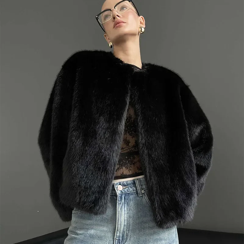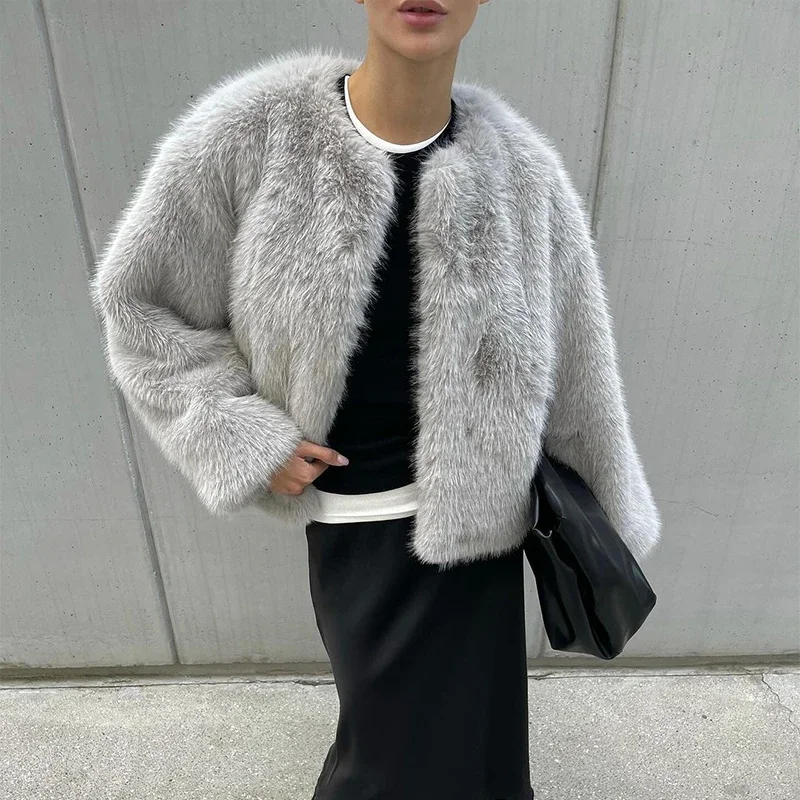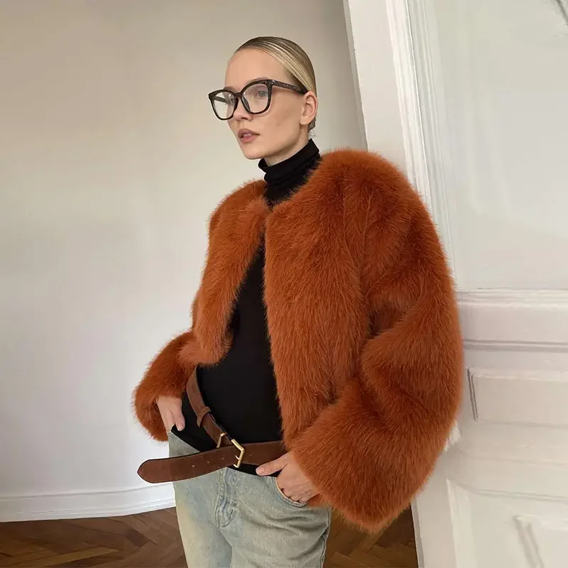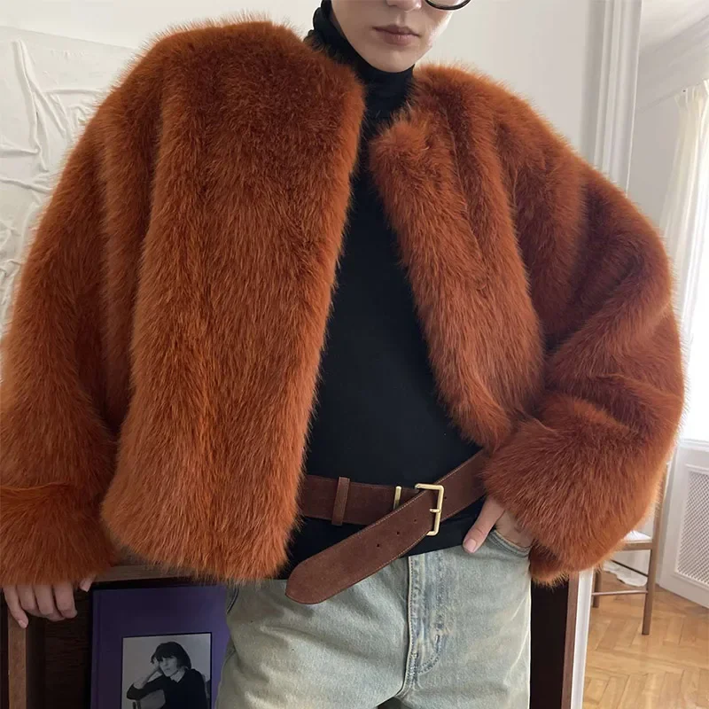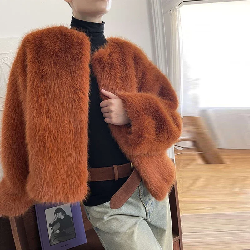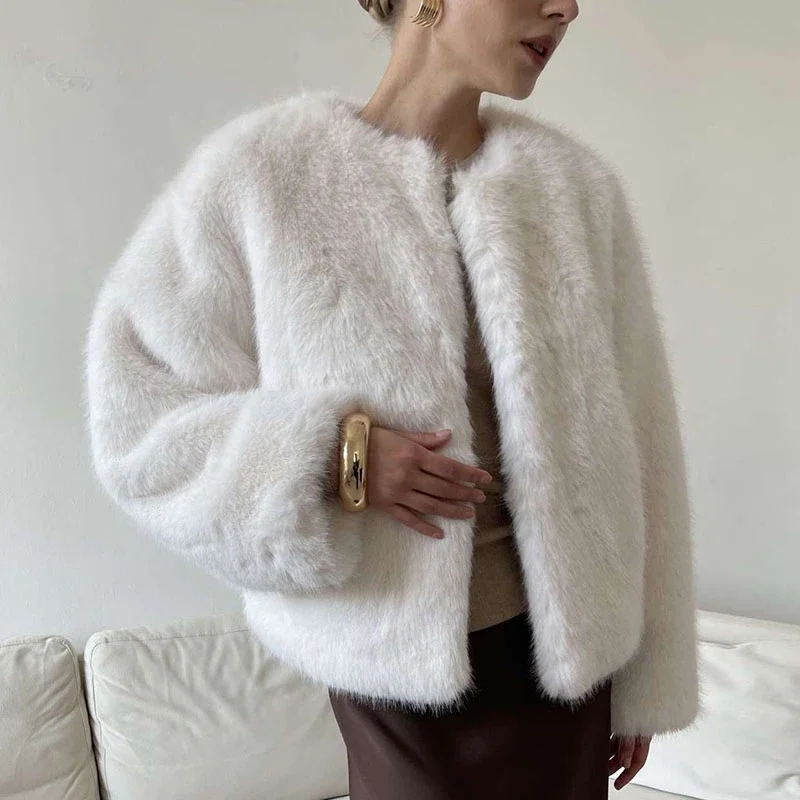maoxiangshop - Elegant Faux Fur Women Coat Thicken Full Sleeve O Neck Lady Short Jacket 2024 Autumn Winter Warm Highstreet Female Outwear