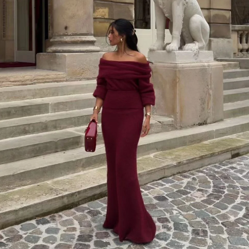 maoxiangshop - Elegant Red Off Shoulder Pleated Knit Maxi Dress For Women Chic Slash Neck Backless Long Sleeve Robe 2024 Autumn Lady Party Gown
