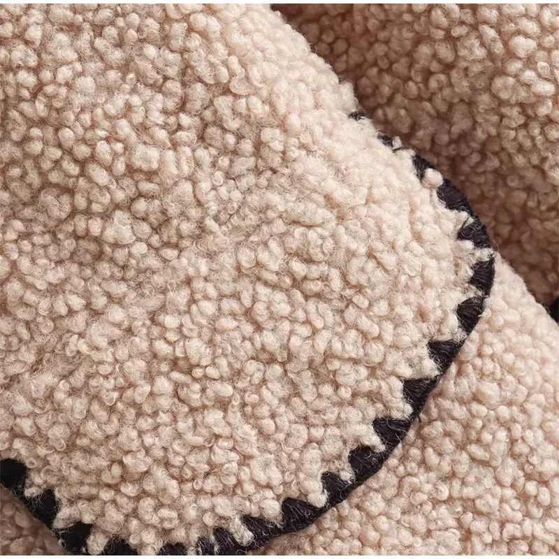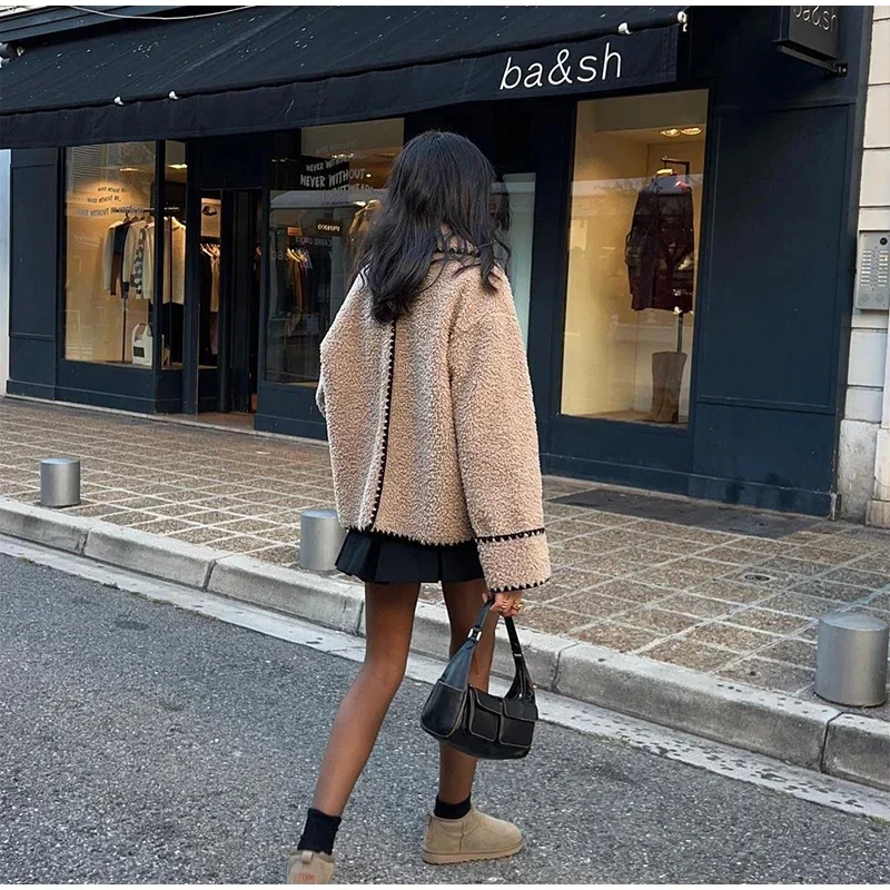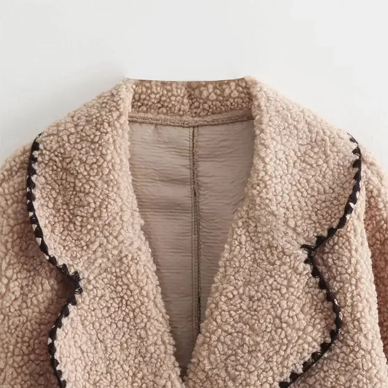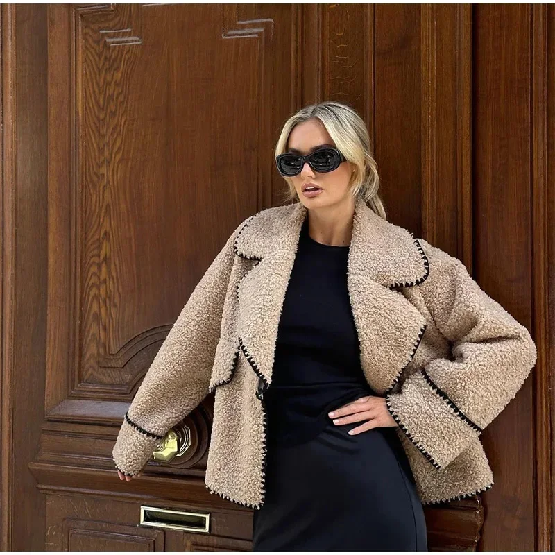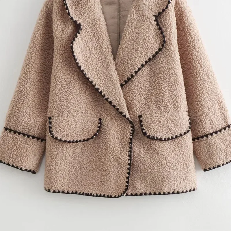 maoxiangshop - Elegant Solid Lapel Lamb Wool Wram Jacket Women O Neck Long Sleeves Slim Pocket Coats 2024 Autumn Winter Fashion Warm Outerwear
