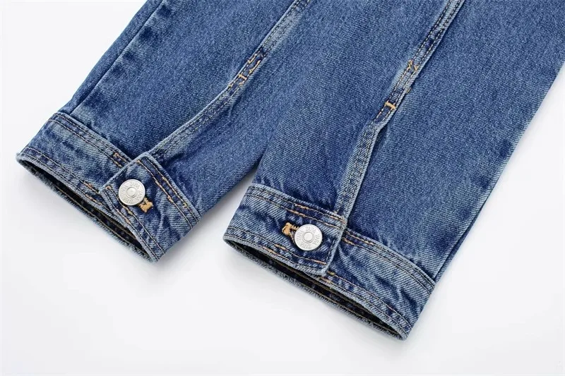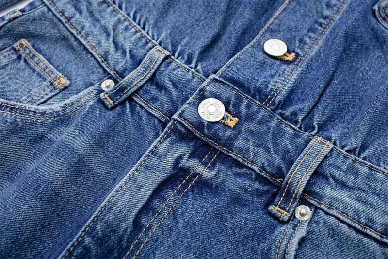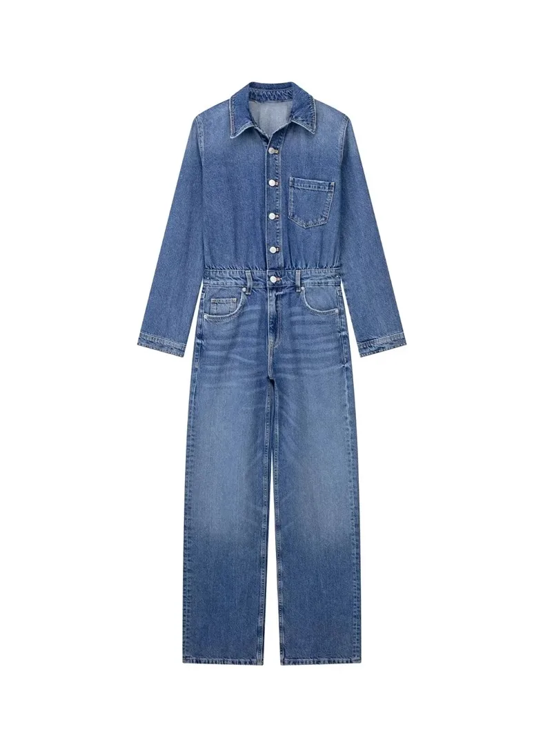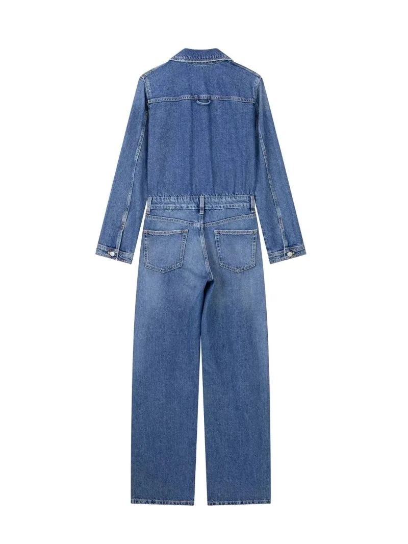 maoxiangshop - European And American Style Blue Denim High Waisted Jumpsuit Women'S Spring And Autumn Collar Casual Fashion Pants Straight Leg