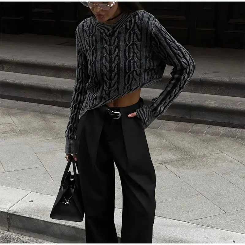 maoxiangshop  -  Fashion Cable Solid Irregular Hem Cropped Knitted Pullovers Women O-neck Long Sleeved Sweaters 2024 Autumn Female Warm Jumpers