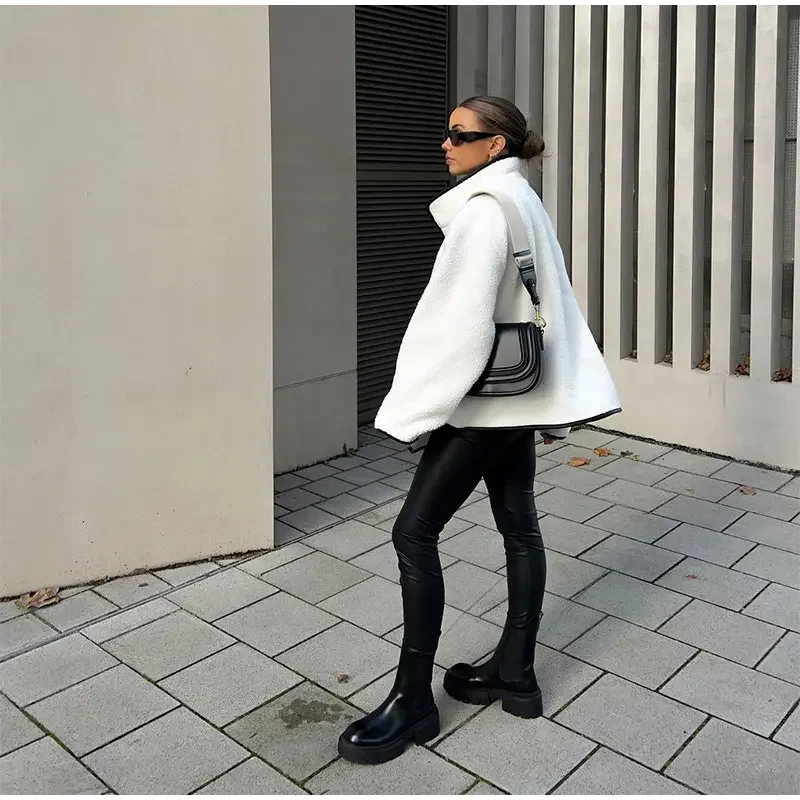 maoxiangshop - Fashion Contrast Lamb Wool Jacket Women Casual Single Breasted Stand Collar Long Sleeves Thick Coat Autumn Winter Lady Outwear