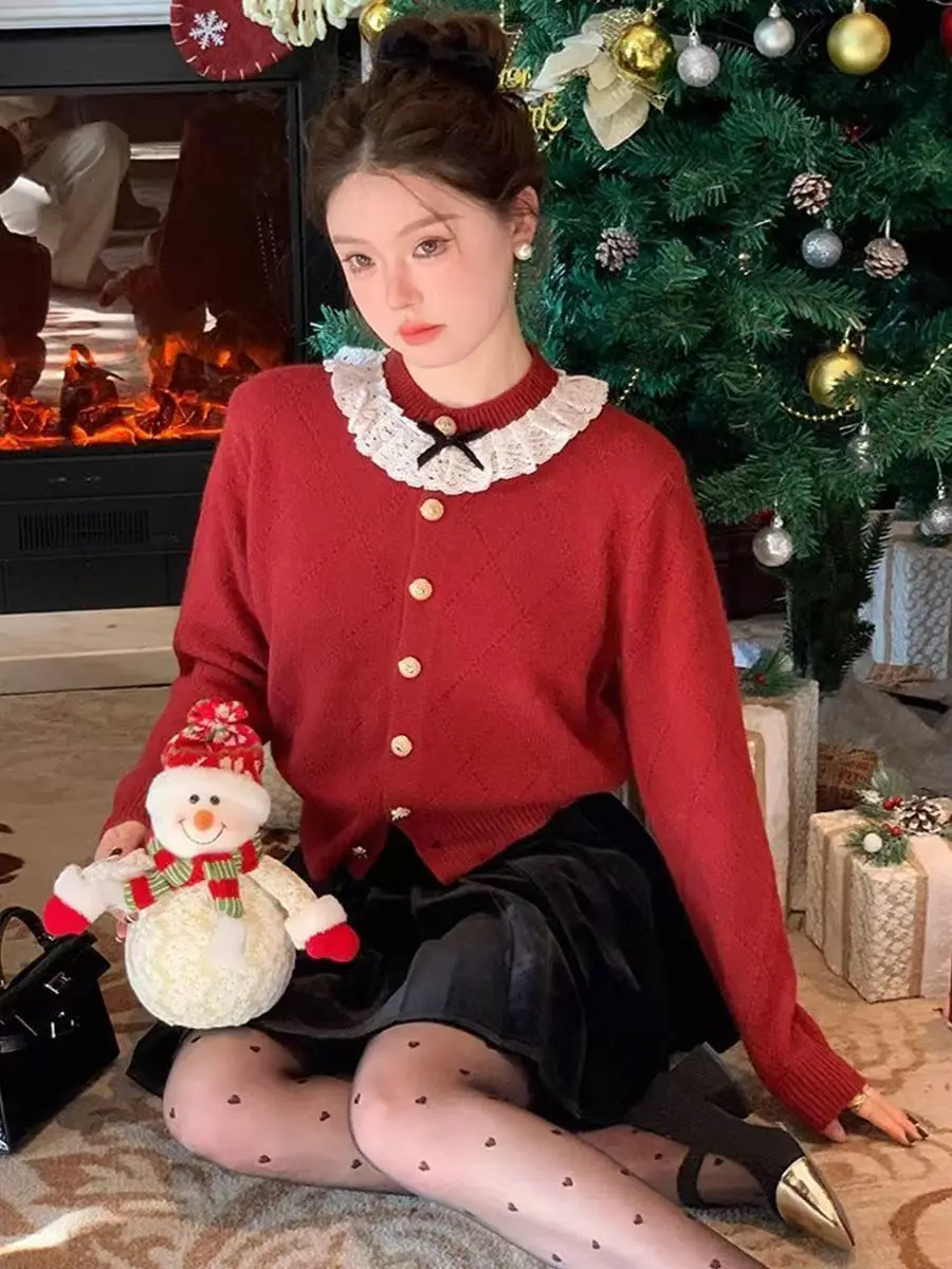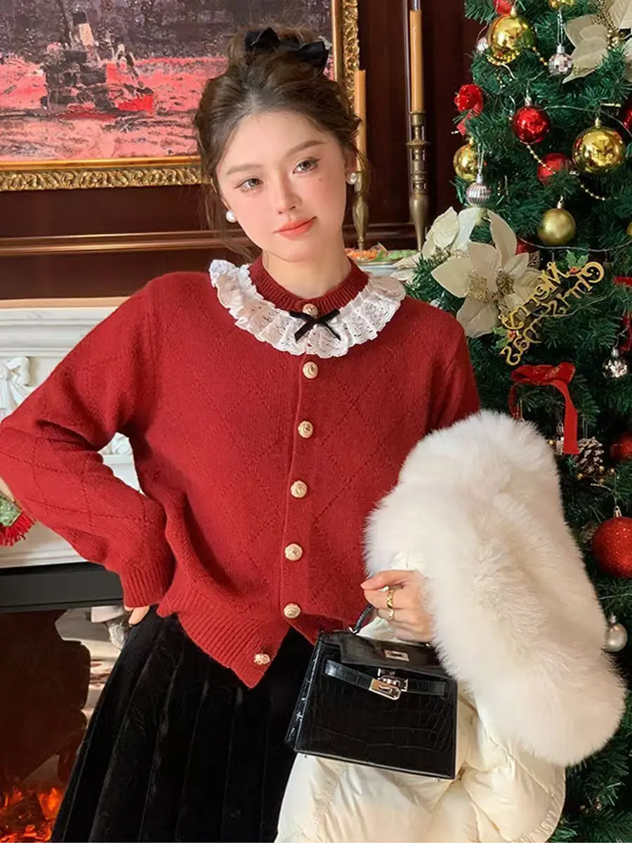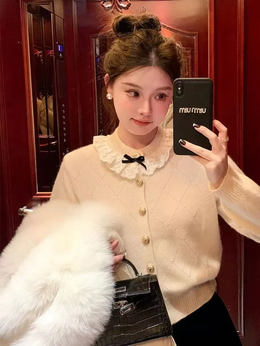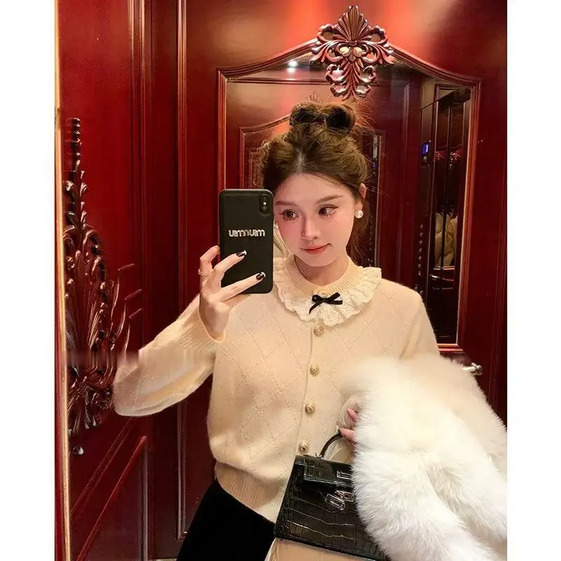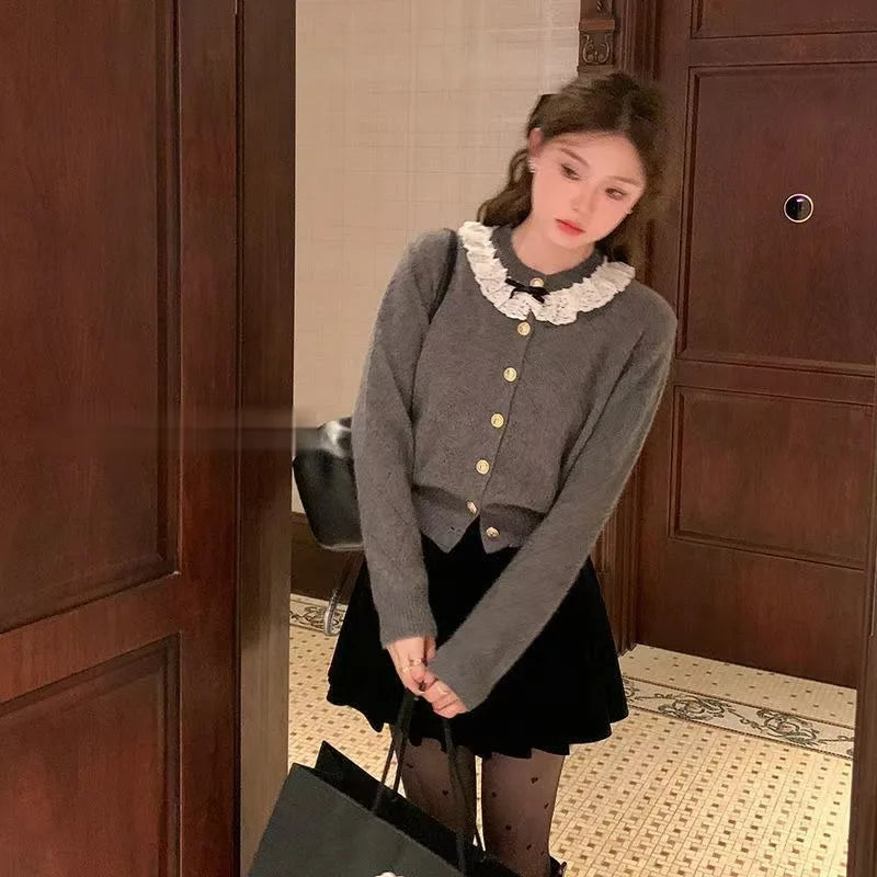 maoxiangshop - Fashion Lace Patchwork Knitting Cardigan Coat Women Autumn Winter Elegant Loose Sweater Temperament All-match Knitwear Tops