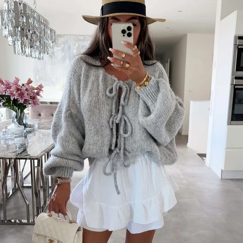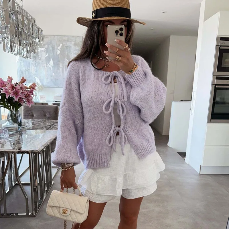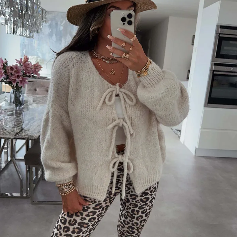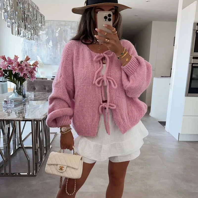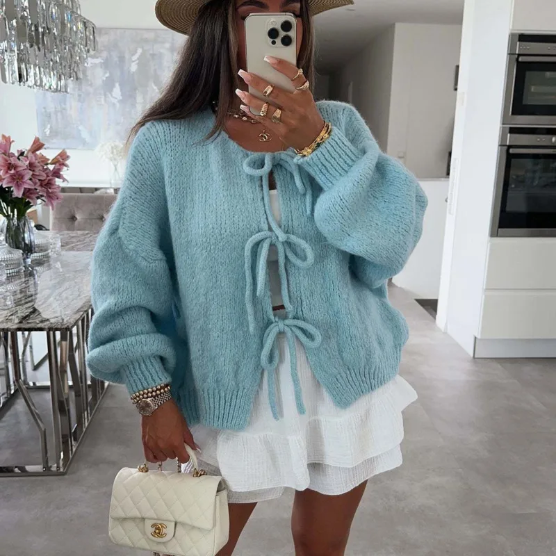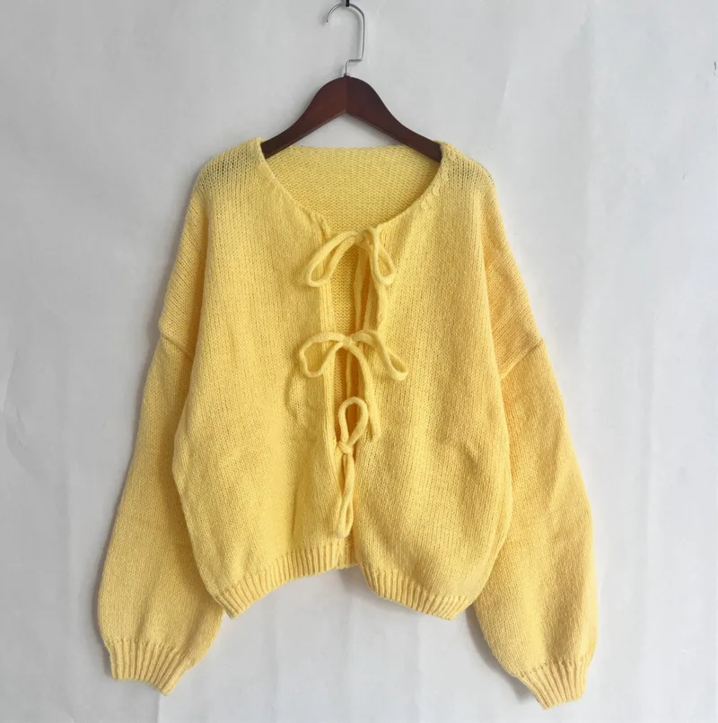 maoxiangshop  -  Fashion Lace Up Bow Knitted Cardigan Woman O Neck Long Sleeve Hollow Out Sweater Coat Autumn Female Casual High Street Knitwear
