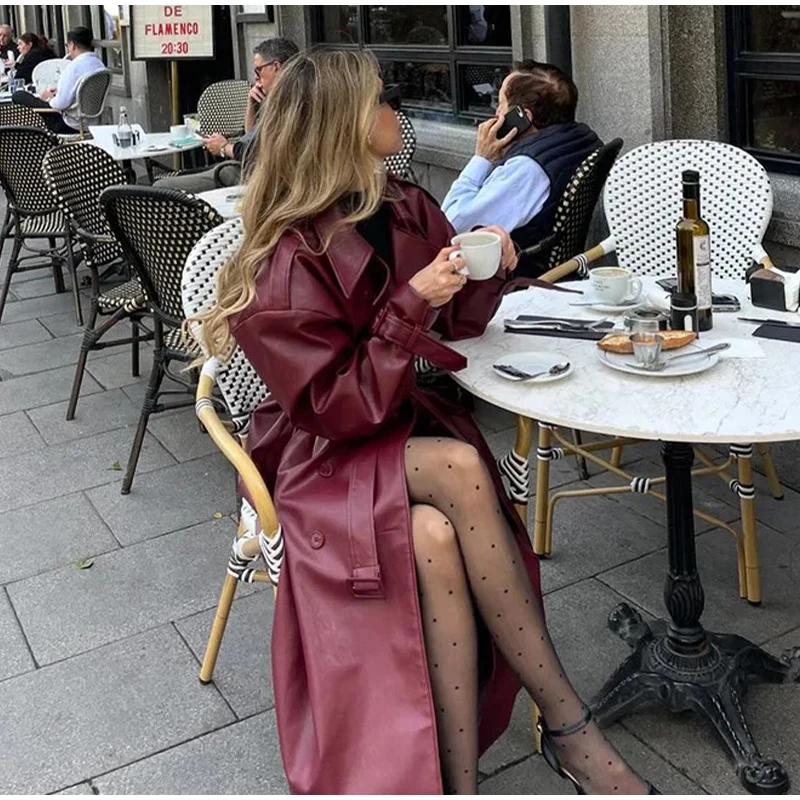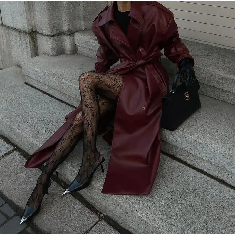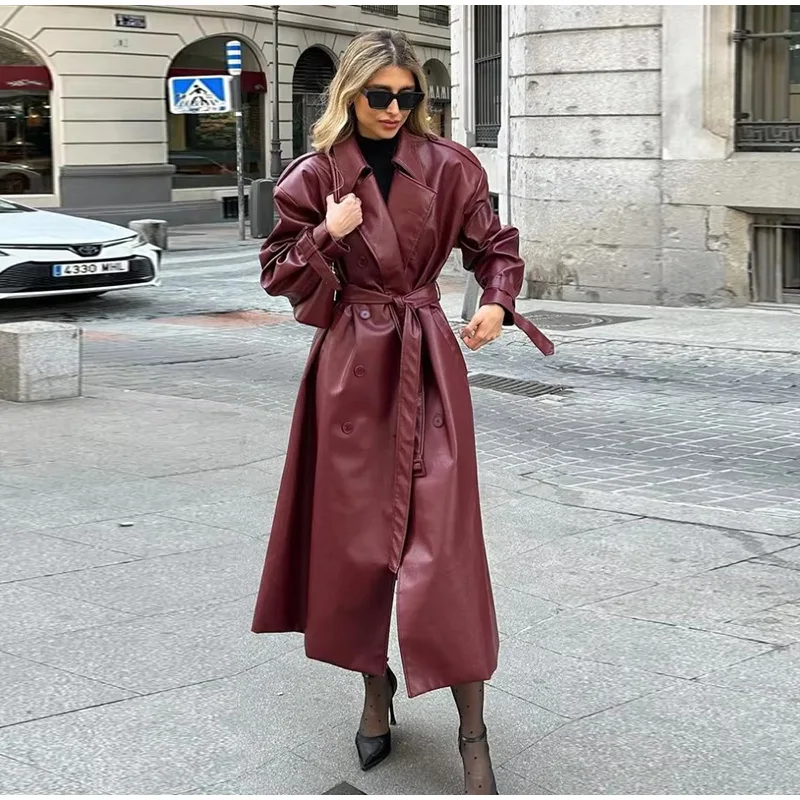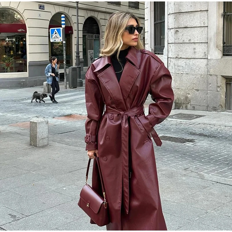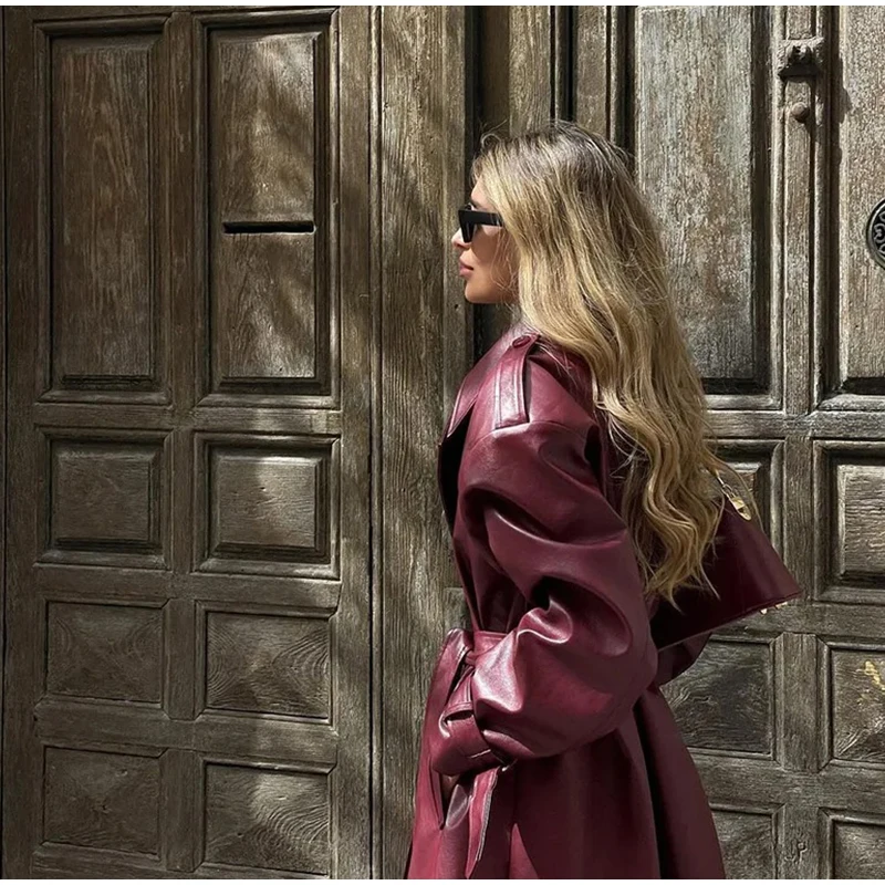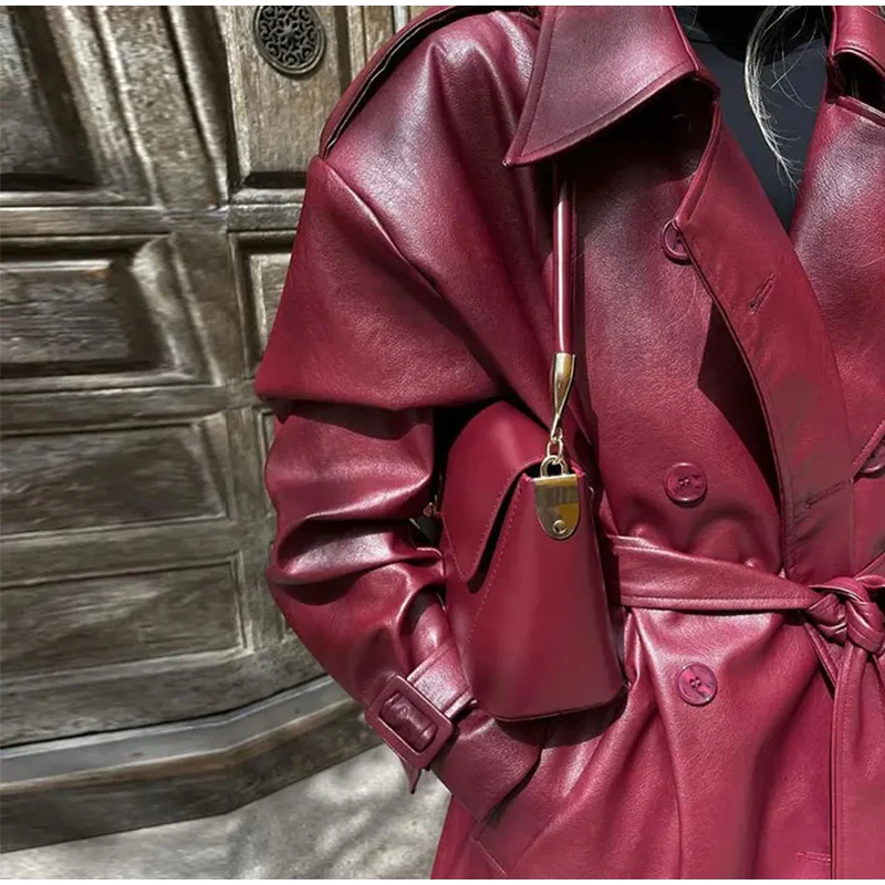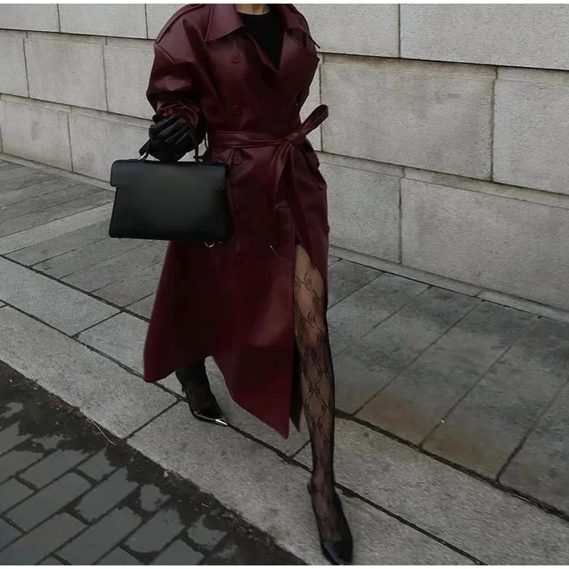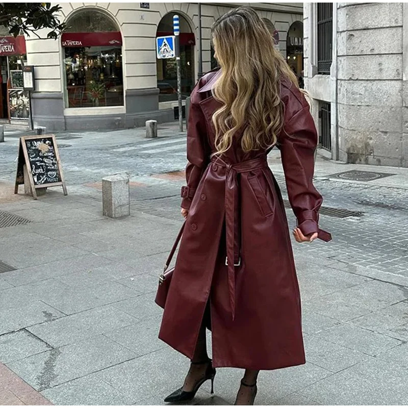 maoxiangshop - Fashion Retro Wine Red Long Women's Coat Turndown Collar Double Breasted Coats with Belt Vintage Windproof Winter Overcoat