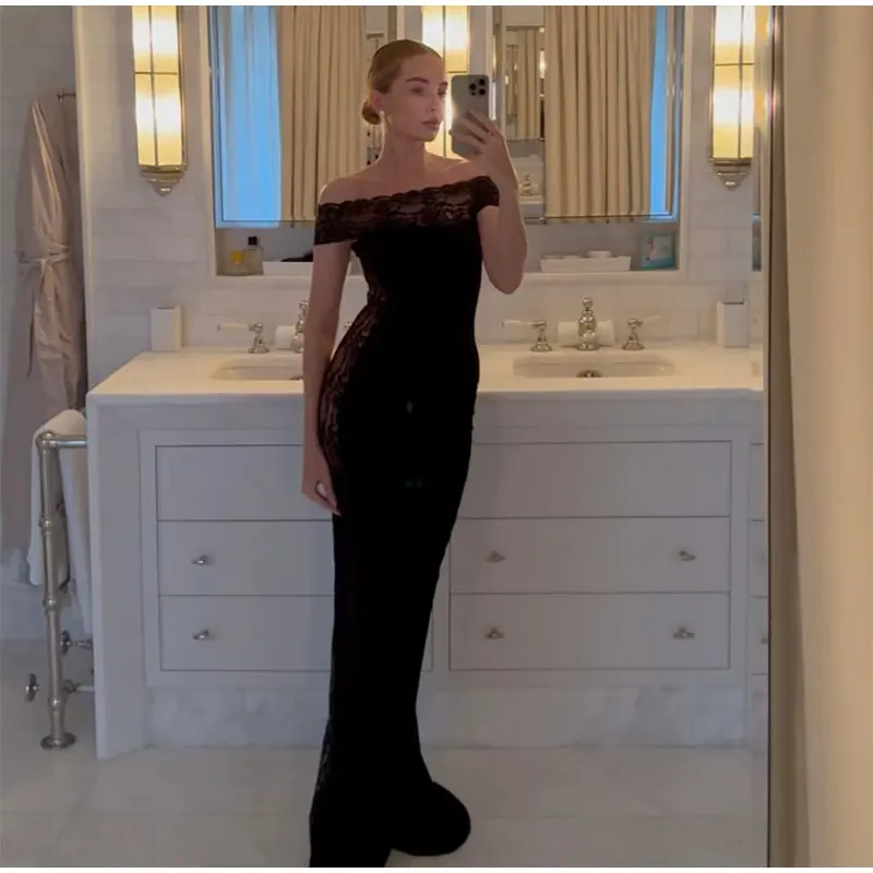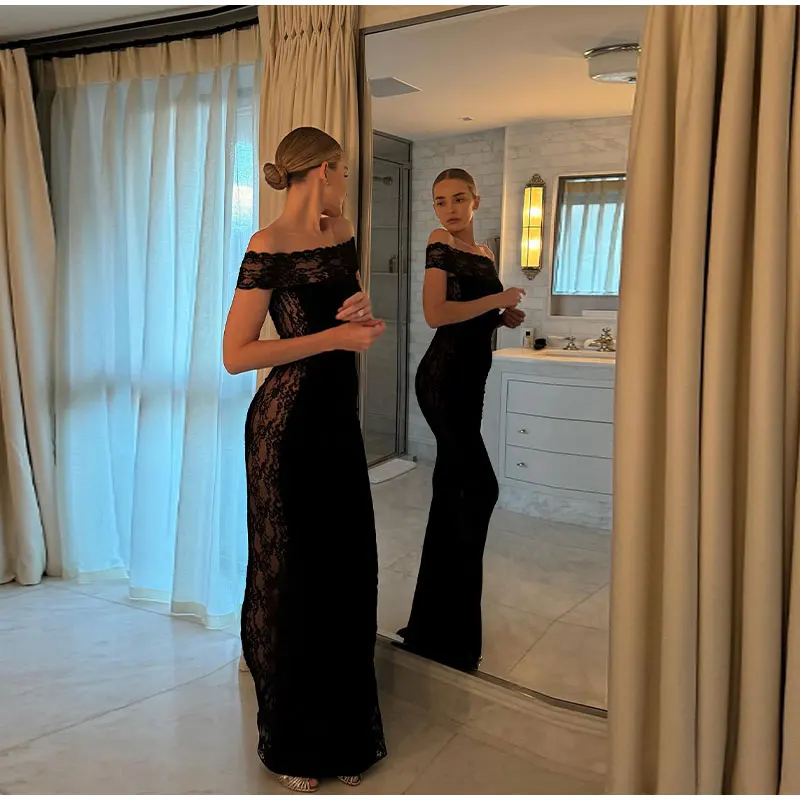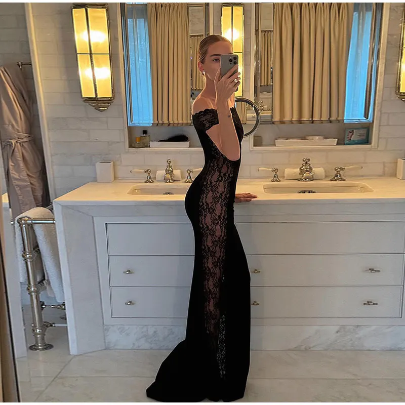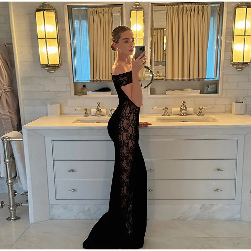 maoxiangshop - Fashion Solid Off Shoulder Lace Maxi Dress Ladies Elegant Sleeveless Slim Fit Dresses Women Winter Banquet Clubwear Vestidos