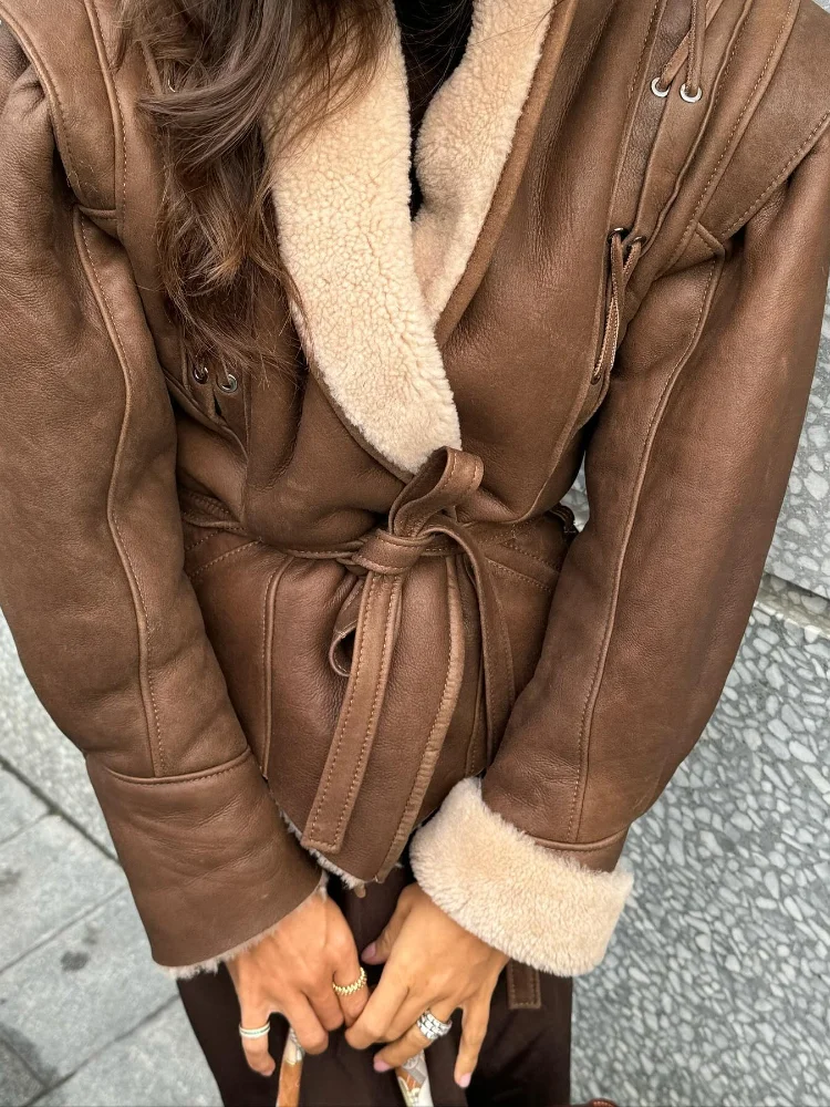 maoxiangshop - Fashion Warm Furry Leather Woman Jacket With Belt Chic Lapel Long Sleeve Motorcycle Coat Lady 2024 Winter High Street Outerwear