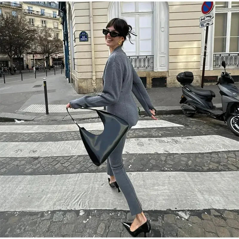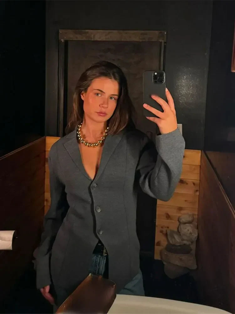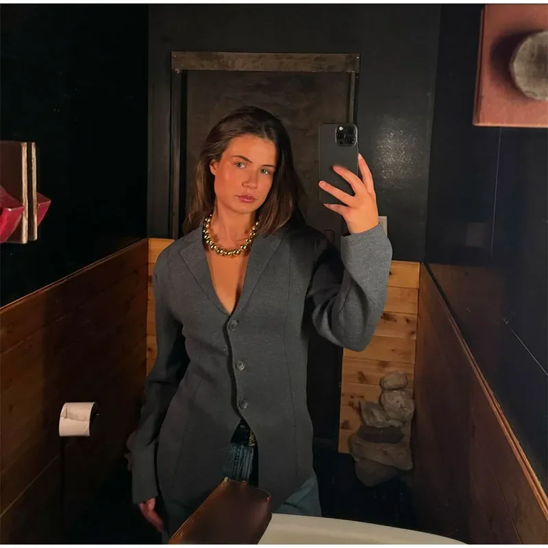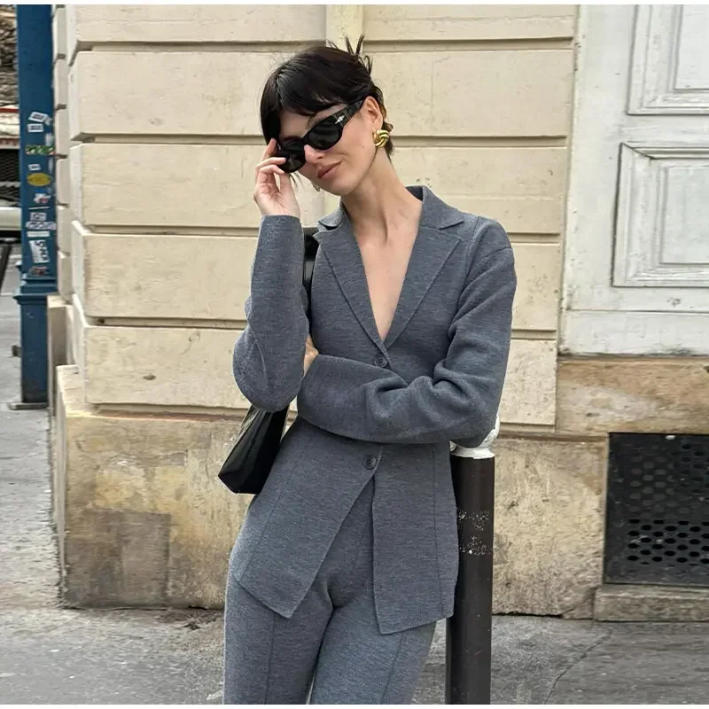 maoxiangshop - Fashion Women Gray Single Breasted Knitted Blazer Elegant Lapel Long Sleeve Slim Coat Autumn Chic Lady Commuting Street Outwear