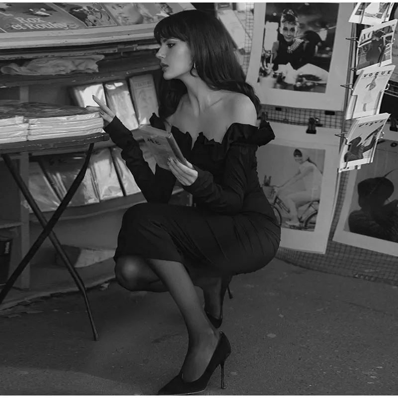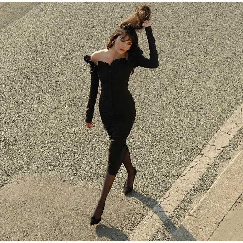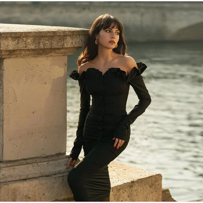 maoxiangshop - Fashion Women Solid Off Shoulder Pleated Dress Elegant Long Sleeve Slim Fit Maxi Robes Chic Autumn Winter Bodycon Party Clubwear