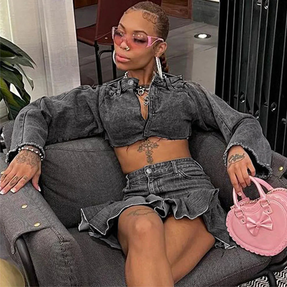 maoxiangshop - High Wiast Mini Dress Suits For Women Denim Slim Short Crop Tops And Folds Skirt Two Piece Set Womens Outfits Autumn