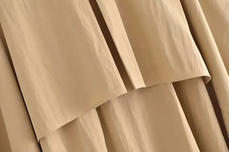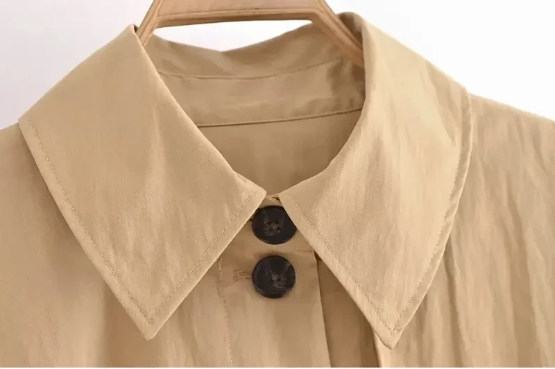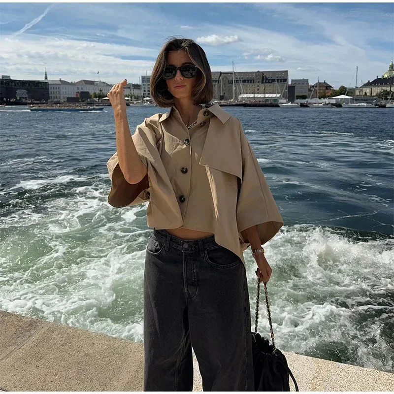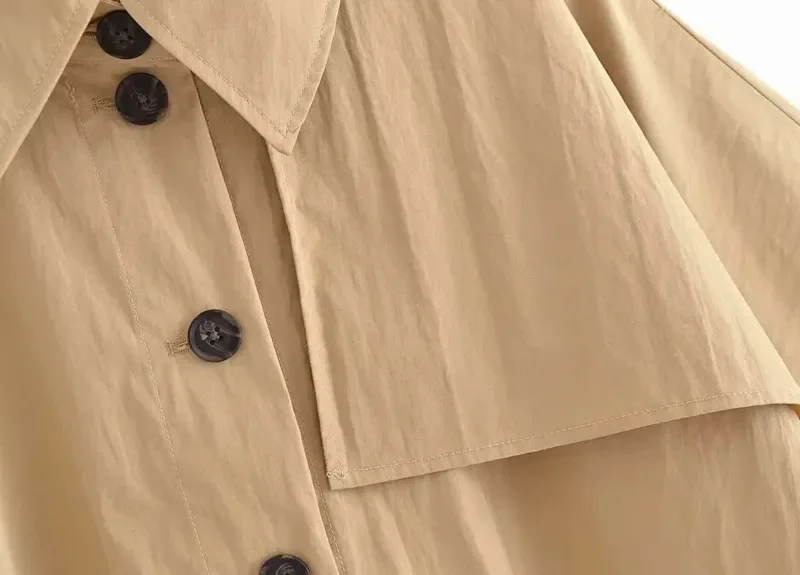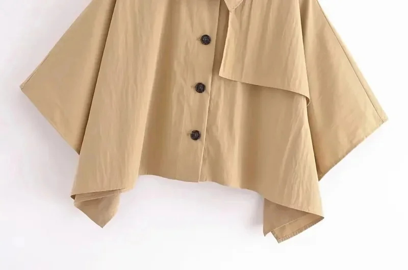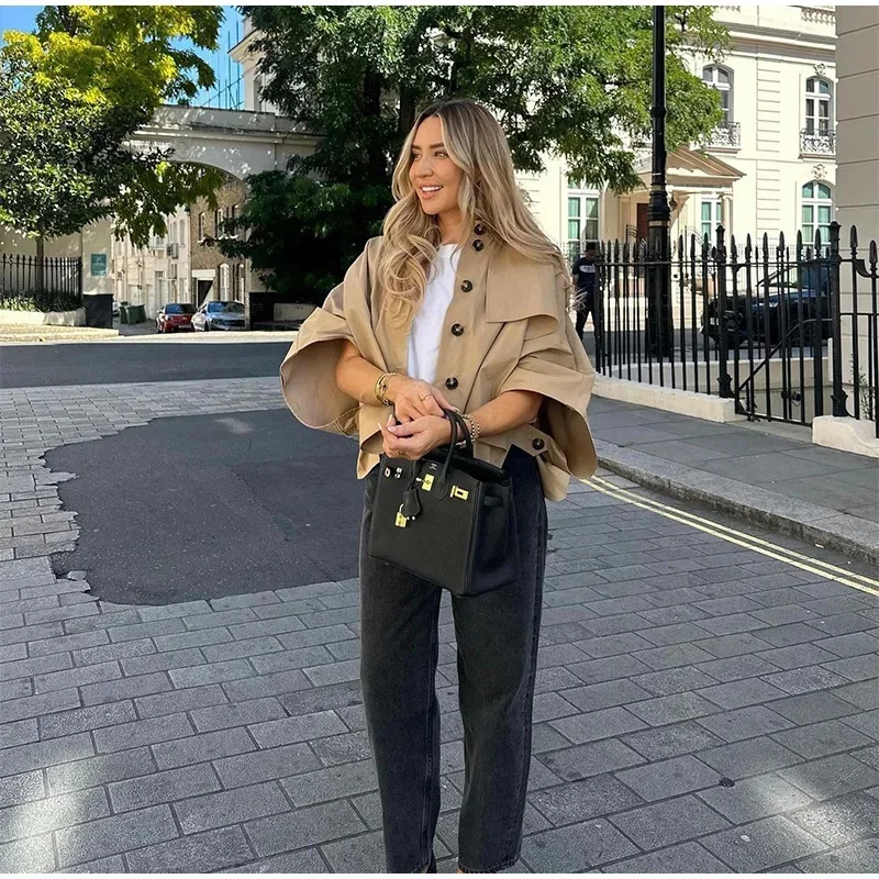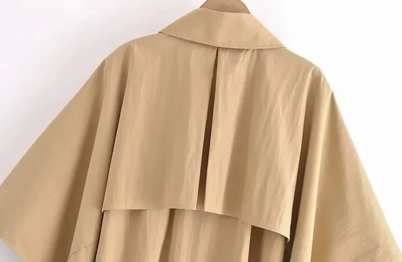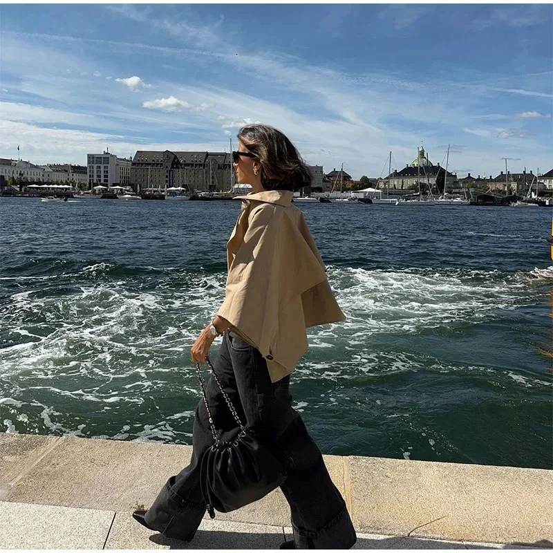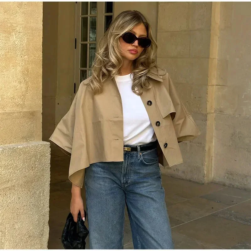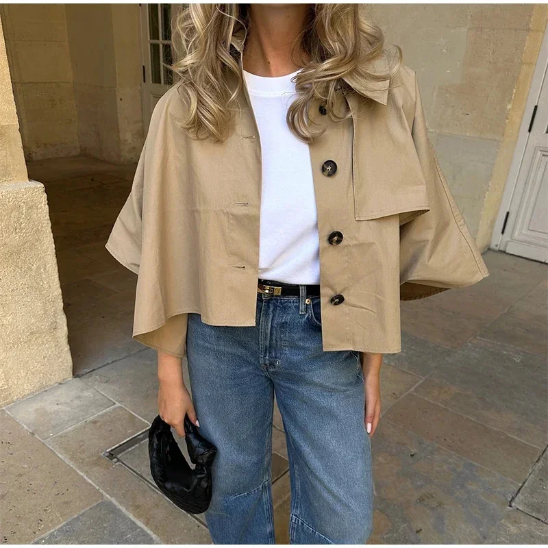 maoxiangshop - Khaki Lapel Short Cape Jacket Women Casual Single Breasted Mid Length Sleeve Coat 2024 Autumn Lady Fashion Street Warm Outerwear