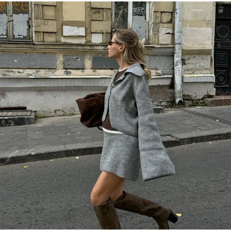 maoxiangshop - Knitted Skirts 2 Piece Set Women Fashion Lapel Flare Button Knitted Cardigan Top Mini Skirt 2024 Autumn Lady All-matching Outfit