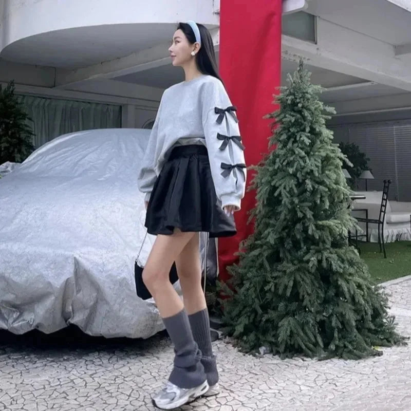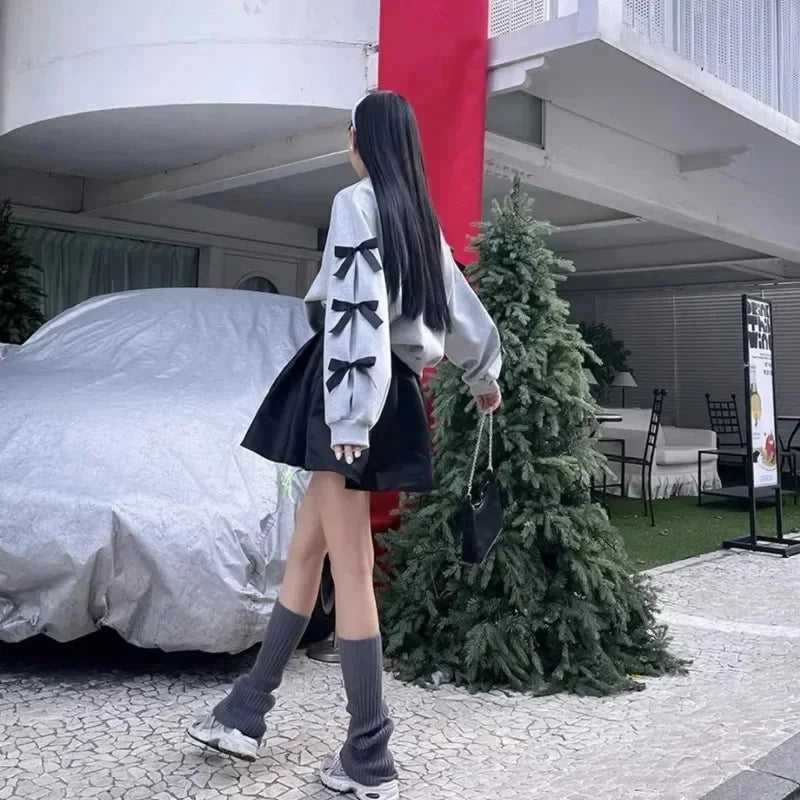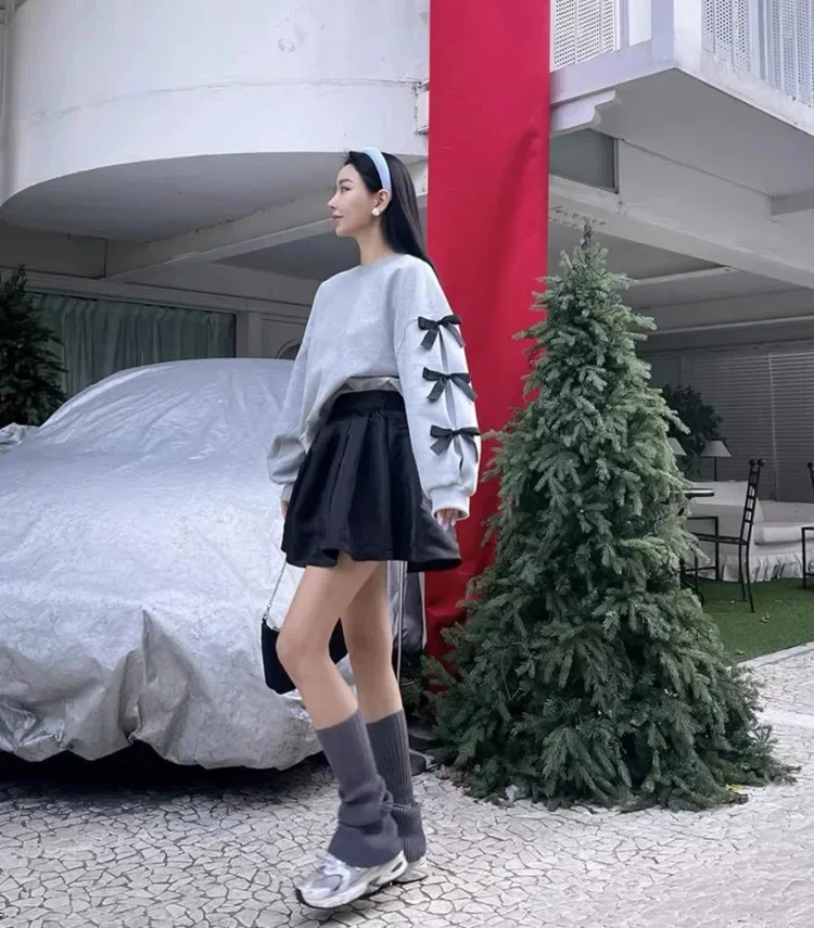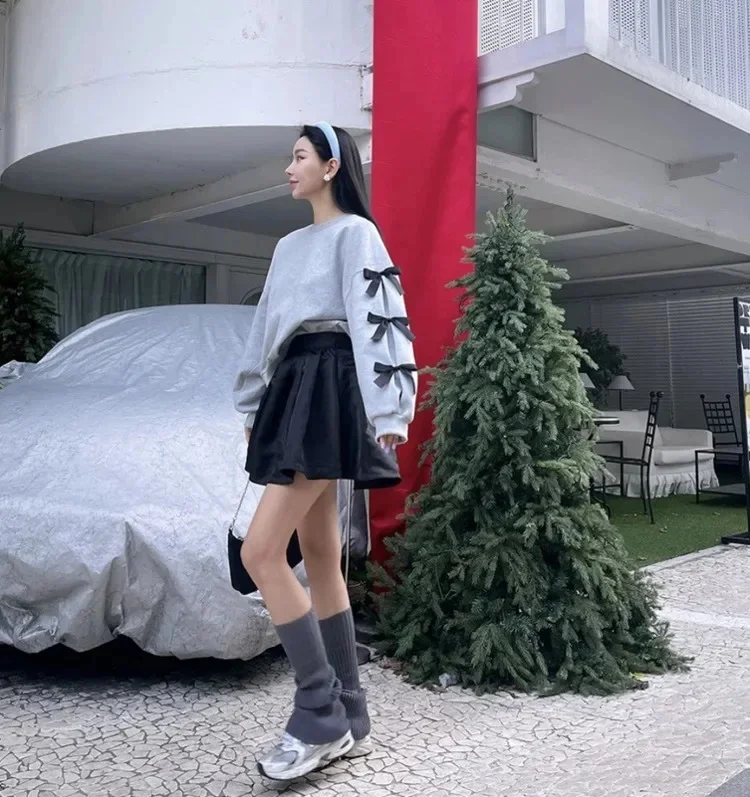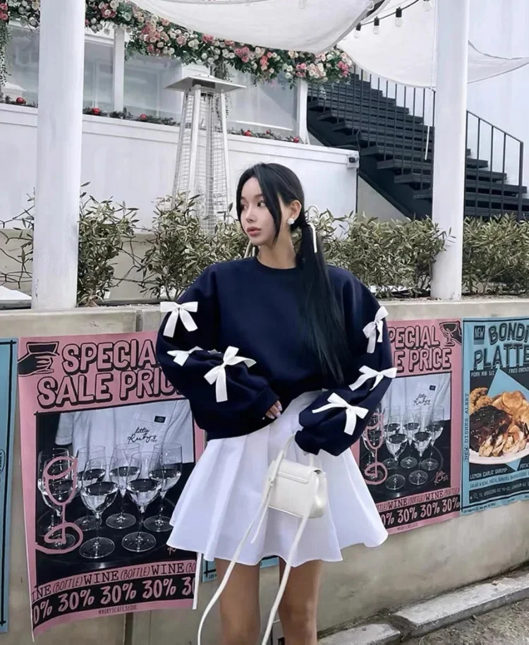 maoxiangshop - Korean Style Bow Design Sweatshirt Top Women Autumn New Casual Loose 2024 Fashion Long Sleeved Round Neck Suit K Pop Clothes