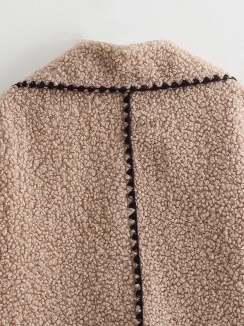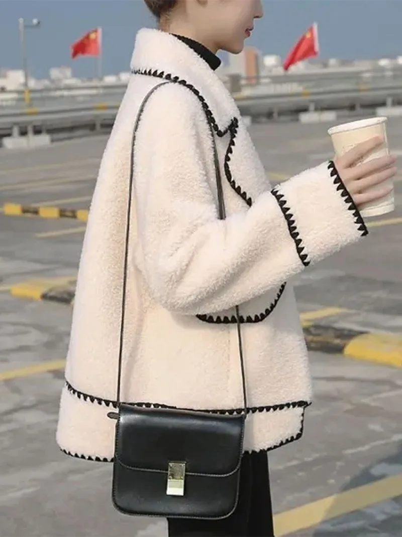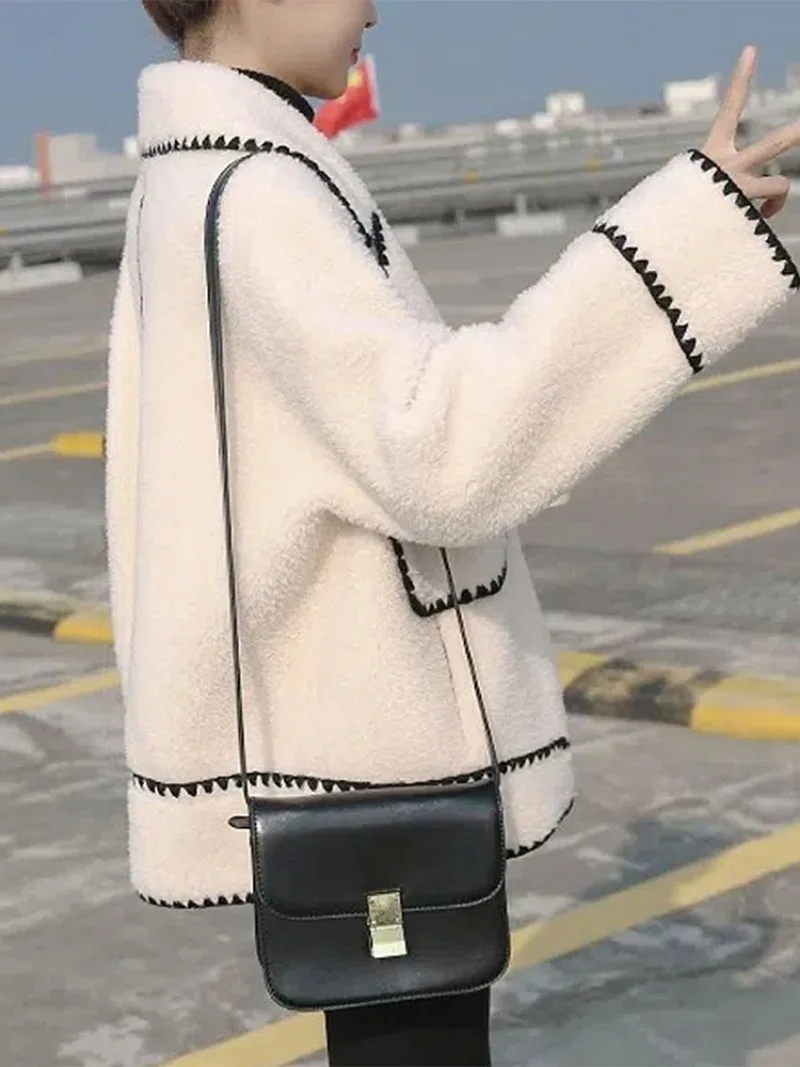 maoxiangshop - Lapel Loose Jackets Women 2024 Autumn Winter Street Long Sleeve Faux Lambswool Jacket Fashion Elegant Casual Coats Femme
