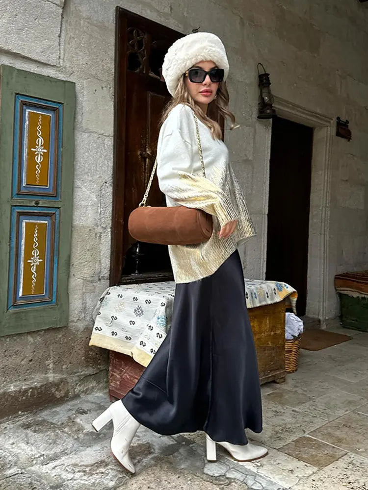 maoxiangshop - Loose Tie Dyed Shiny Metallic Sweater Women Round Neck Long Sleeve Knit Pullover 2024 Spring Autumn Fashion Lady Street Jumper