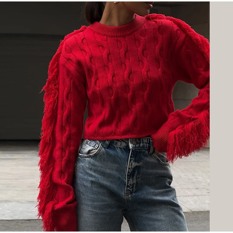 maoxiangshop - Luxury Red O-neck Knitted Pullover Women Chic Tassels Spliced Long Sleeves Cropped Sweater 2024 Autumn Lady Street Knitwear