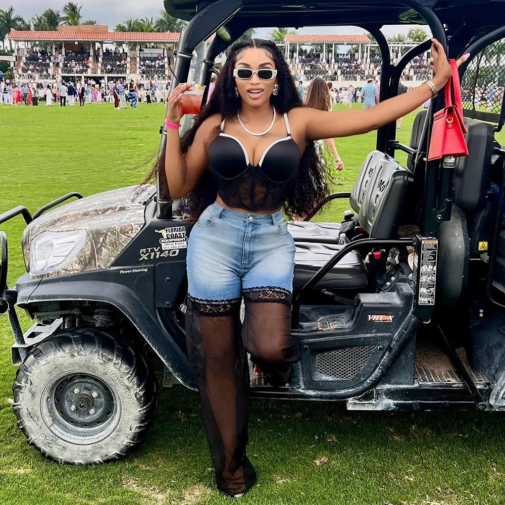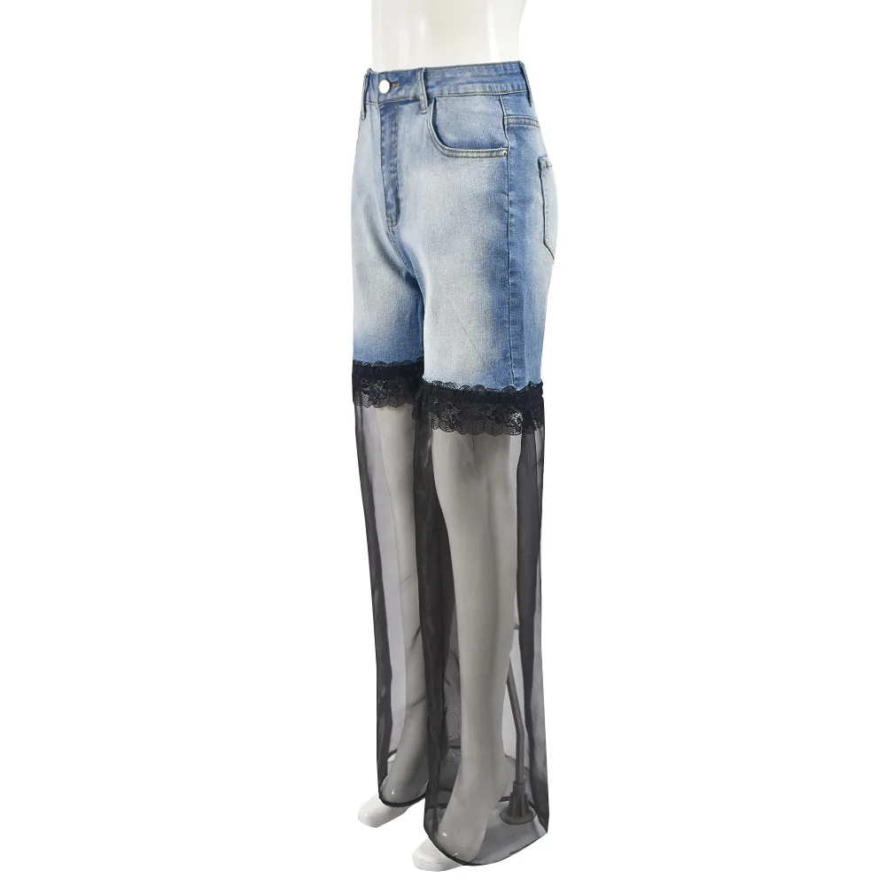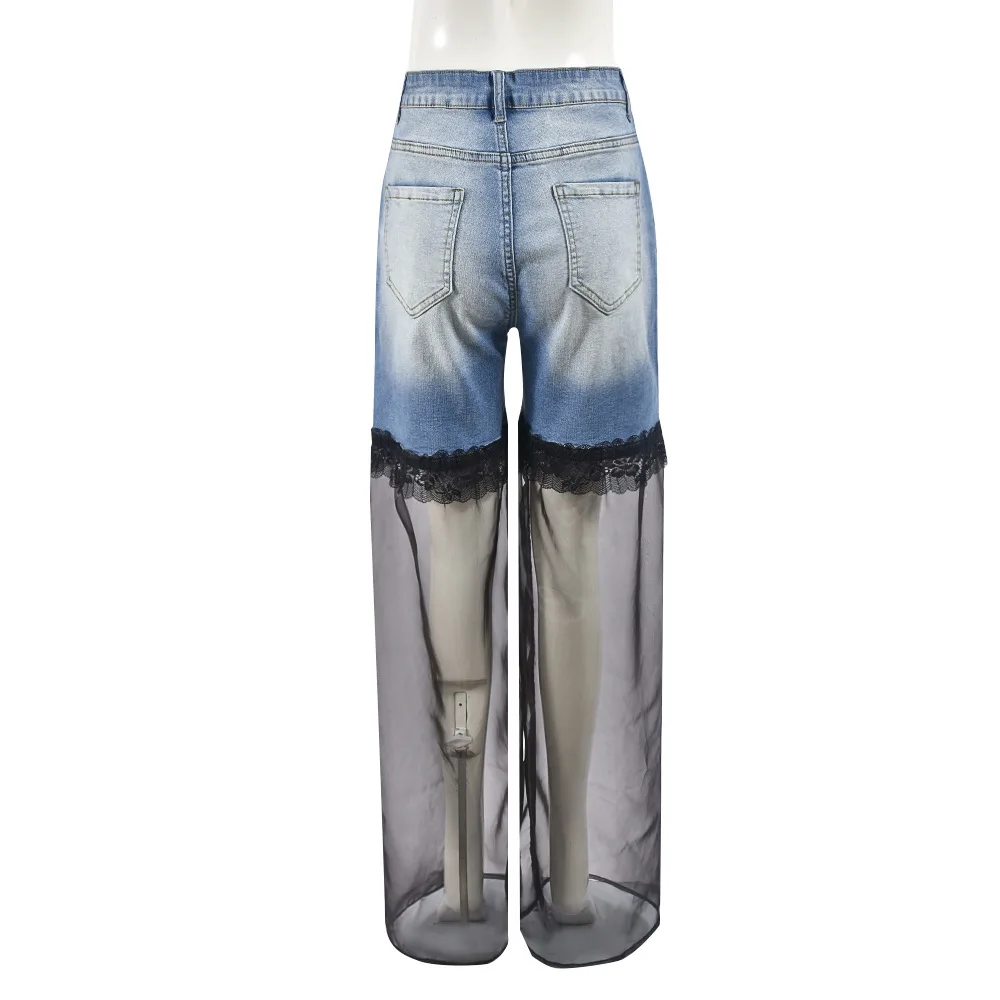 maoxiangshop - Mesh Patchwork Baggy Jeans Women Fashion High Waist Loose Straight Trousers Casual Streetwear Spring Autumn Denim Pants