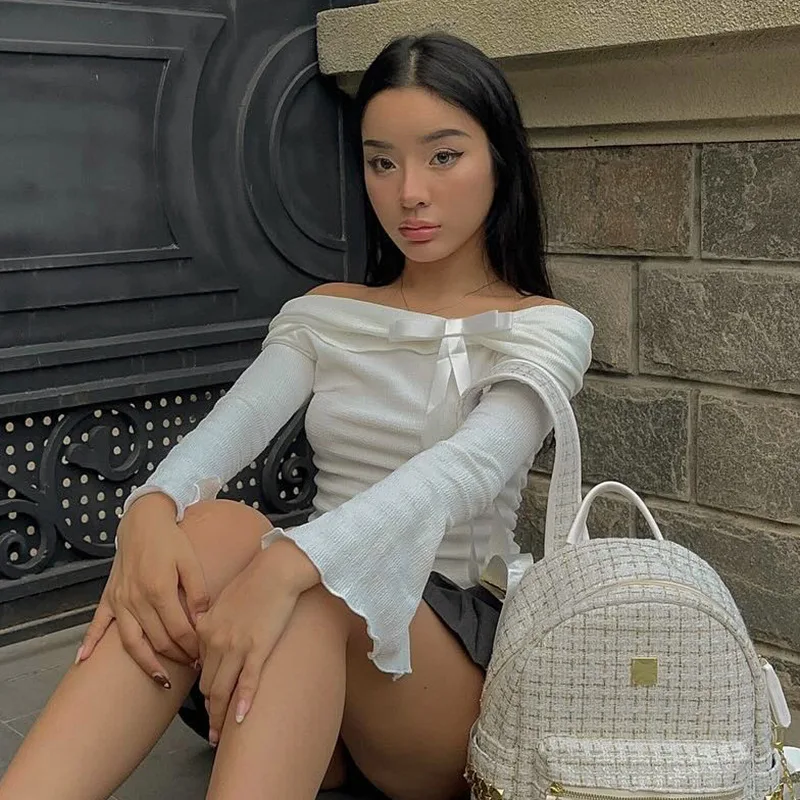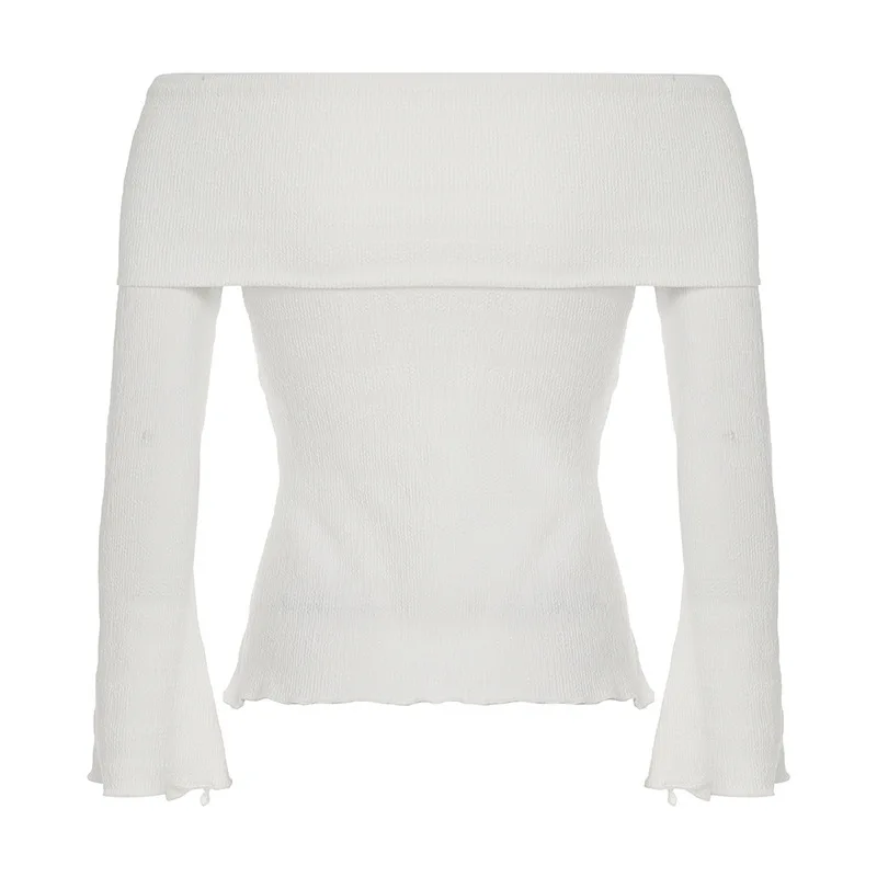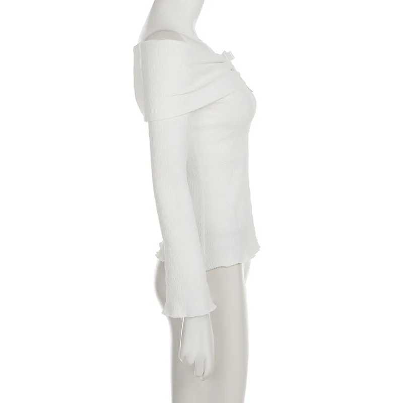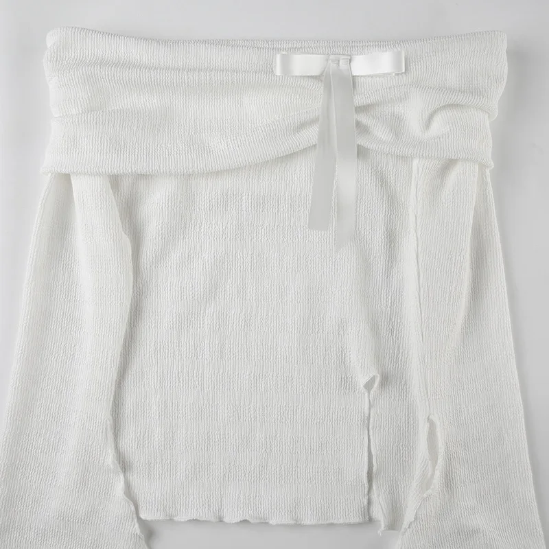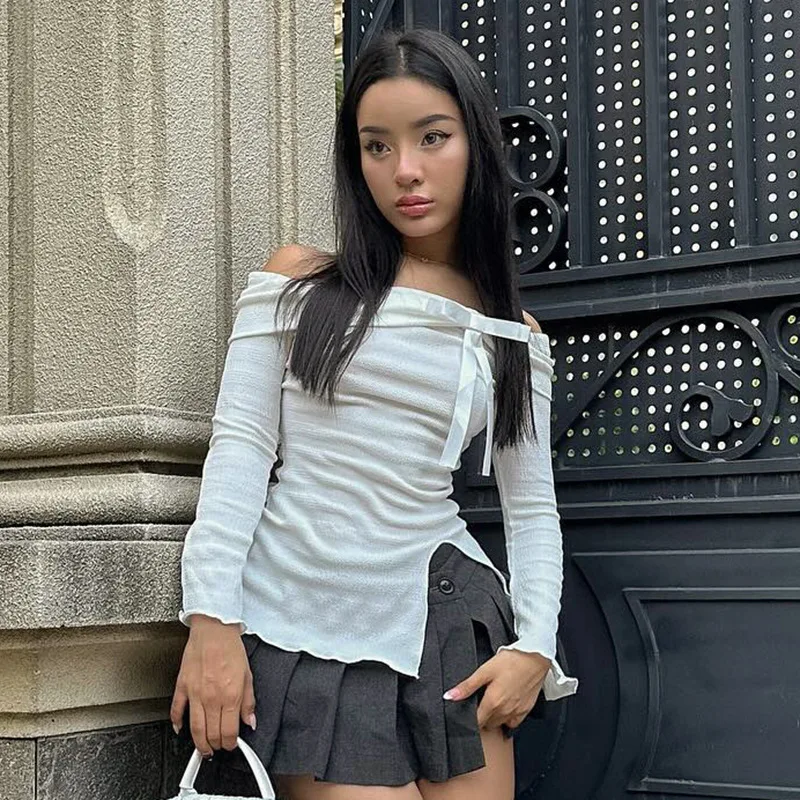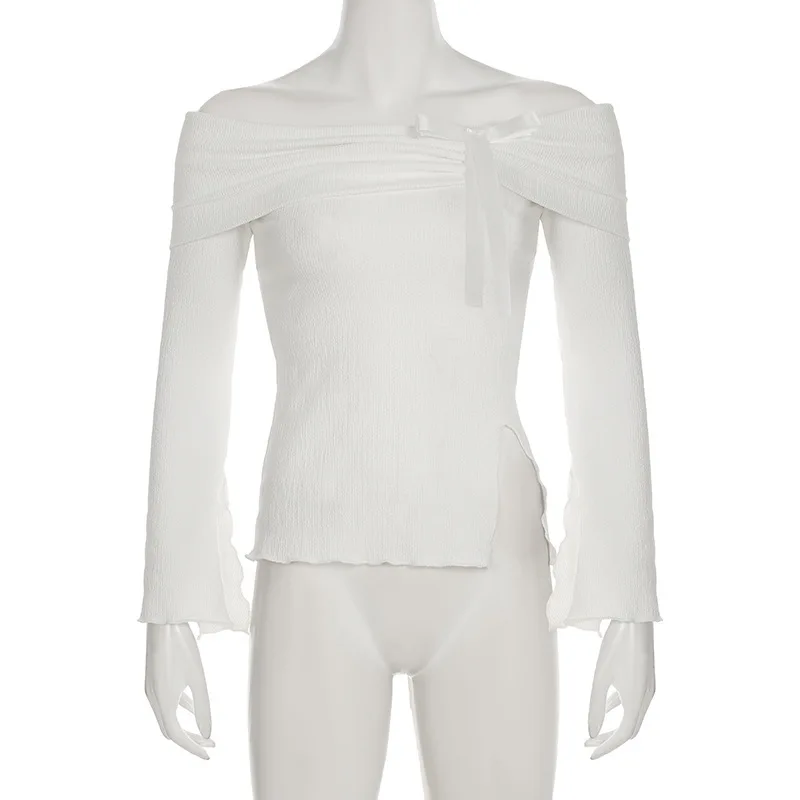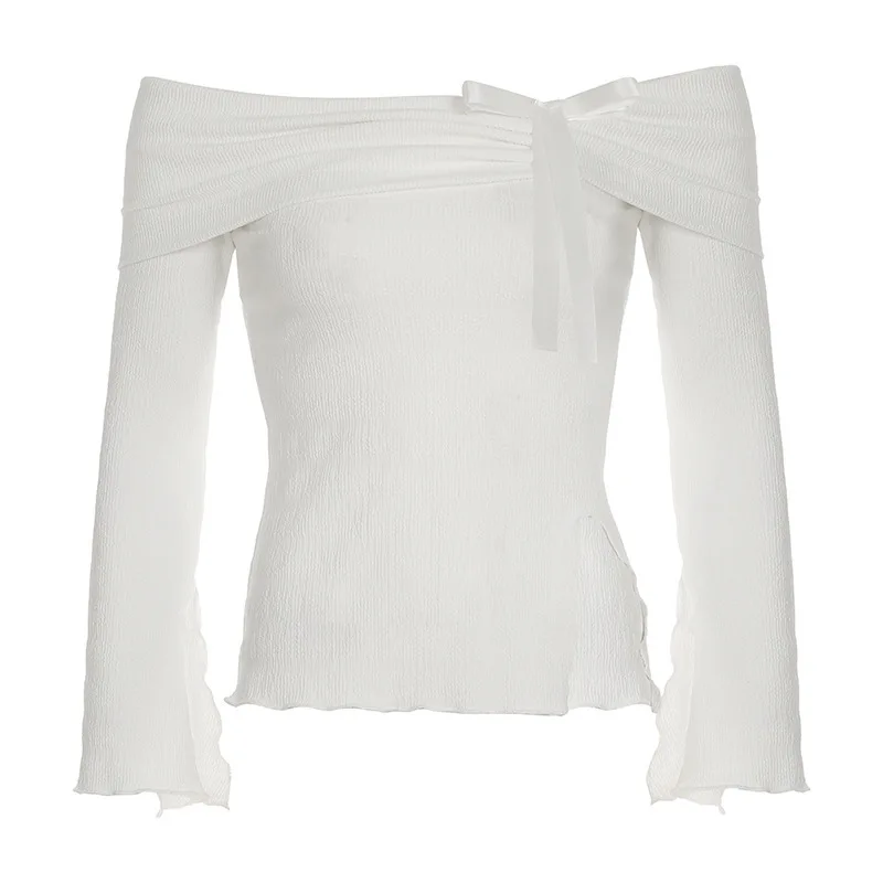 maoxiangshop - Off Shoulder Bows Tie Slit Top Women Flared Long Sleeved Solid Slim Versatile T-shirt Spicy Girl Autumn/Winter Streetwear