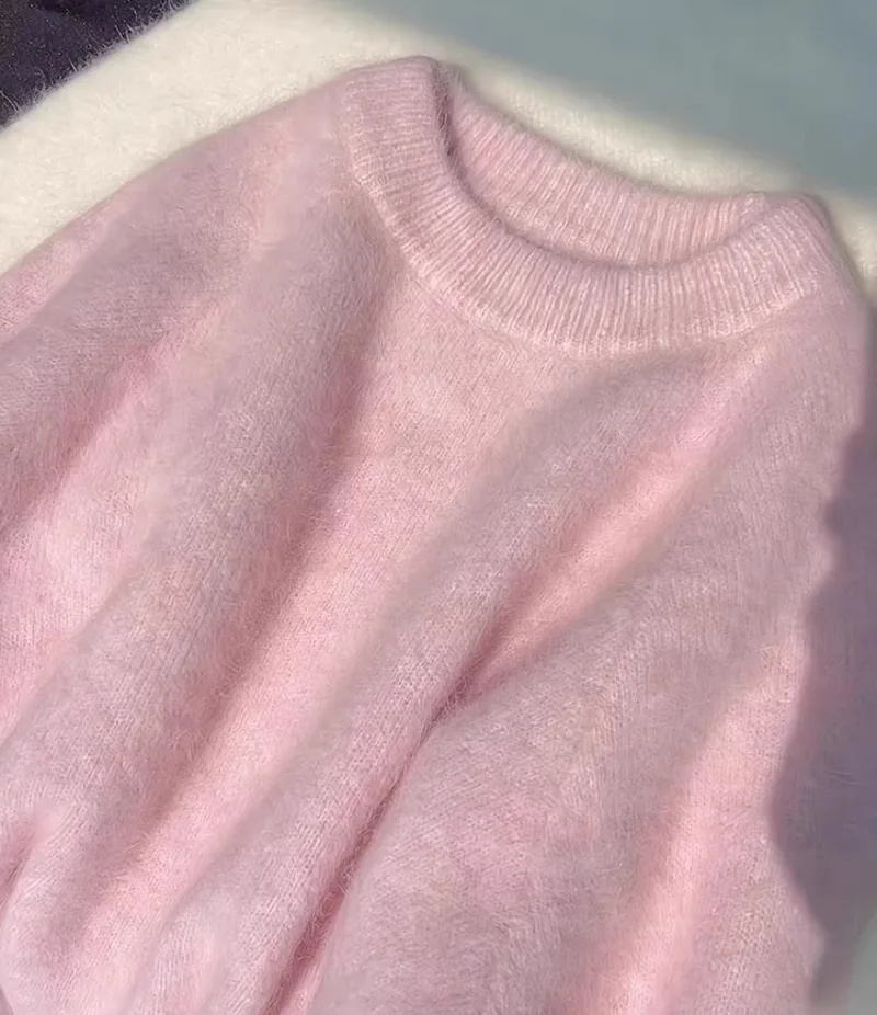 maoxiangshop  -  Pink Soft Knitted Sweater Women 2024 Autumn Winter New Loose Long Sleeved Top Solid Color Simple O Neck Pullover Coat Knitwear