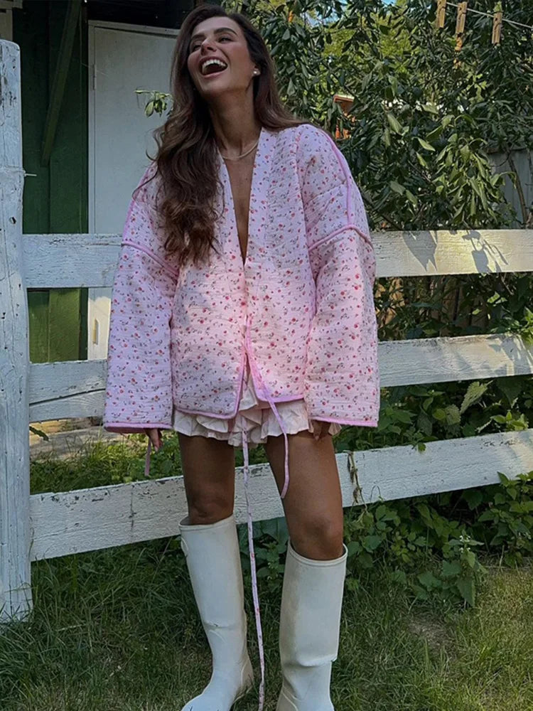 maoxiangshop - Printed Y Collar Lace Up Thin Coats Women Casual Loose Patchwork Long Sleeve Padded Jackets Female Autumn Chic Elegant Outwear