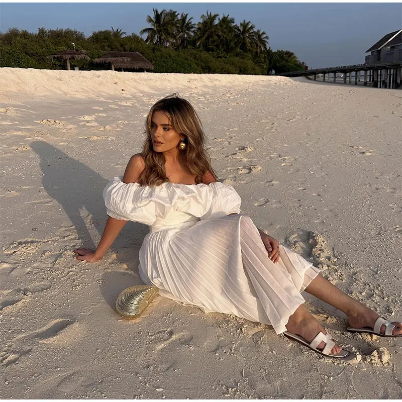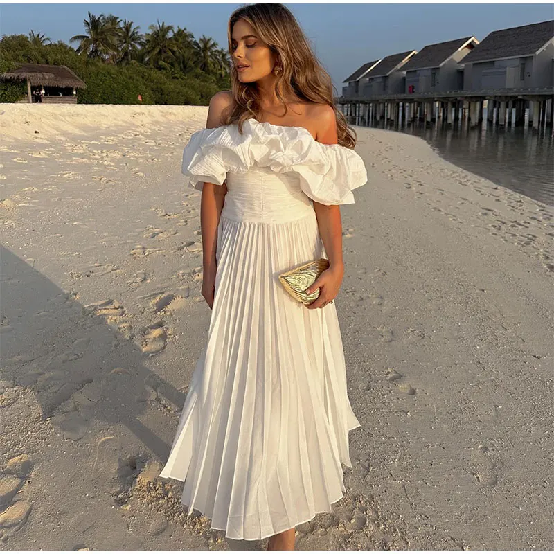maoxiangshop - Sexy Solid Off Shoulder Pleated Maxi Dress For Women Chic Slim Fit Short Sleeve Robes Autumn Winter Party Ladies Dresses
