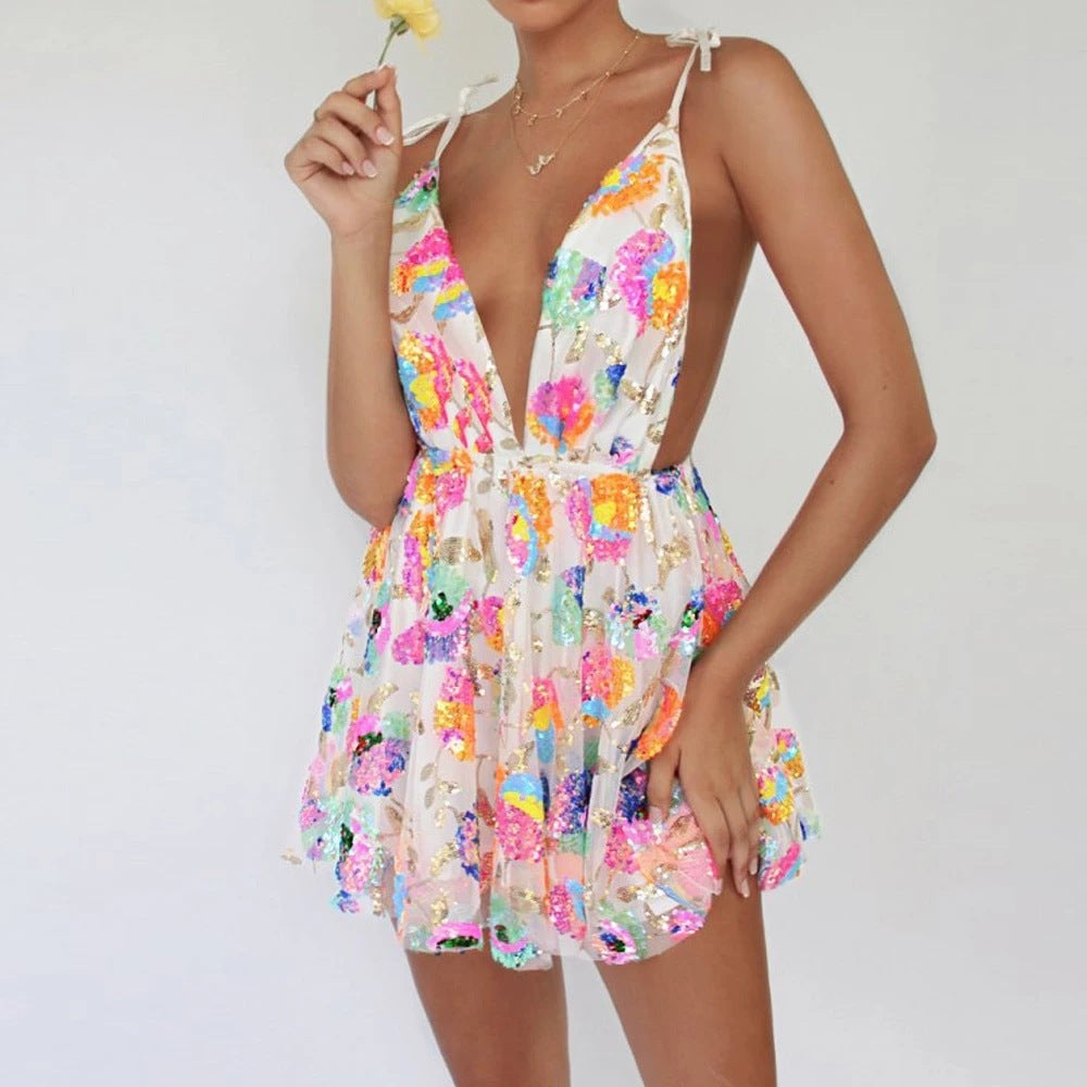 Halloween Costumes College Women's Sexy Skirt with Deep V Backless Sequined Floral Lace-up