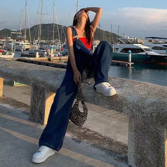 late summer outfits Summer and Autumn New American Retro High Waist Denim Suspender Pants Women's Wide Leg Loose Casual Straight Slimming Mop Pants
